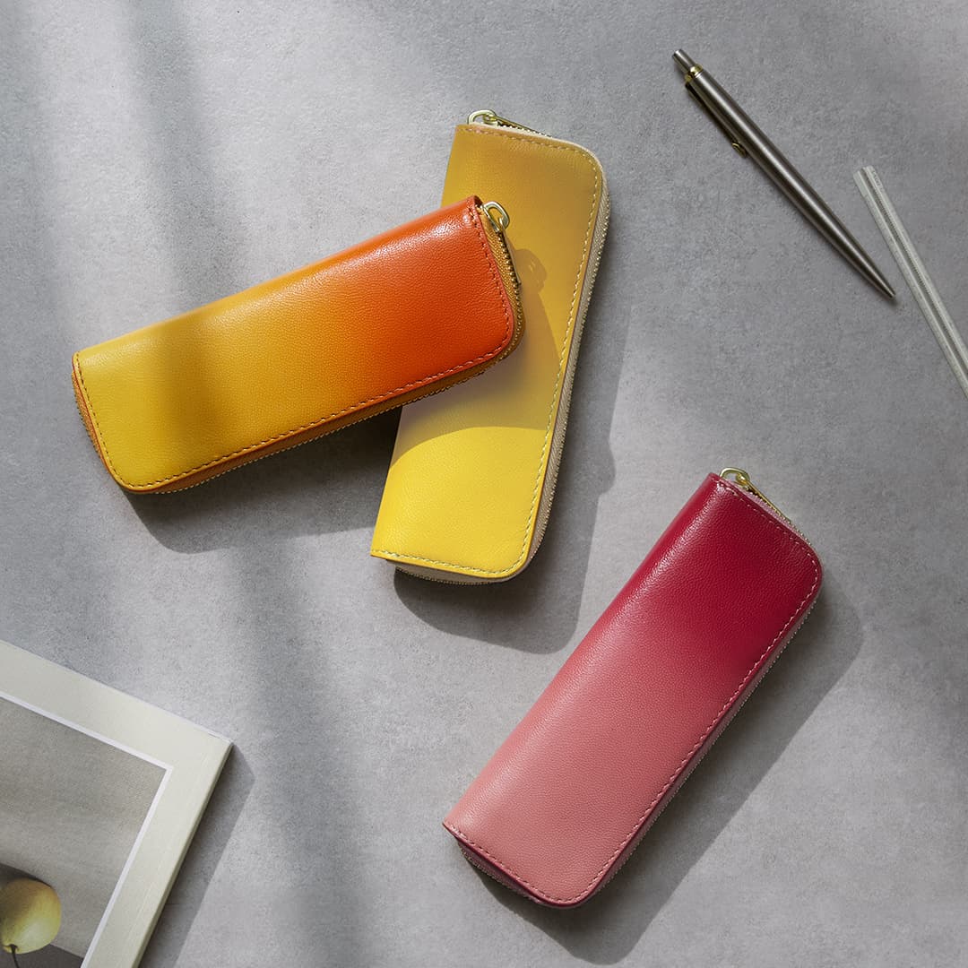 日本の四季を表現したイロドリシリーズ。多彩なグラデーションレザーが映えるディティールにこだわり、職人の手仕事で仕立てた、フラットタイプのペンケースです。イロドリ豊かなカラーバリエーションはギフトにもおすすめです。