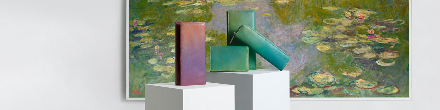 印象派の巨匠クロード・モネの繊細な光と色彩を表現したモネシリーズ。 キャンバスのように色を重ねてハンドエイドで染め上げた オリジナルレザーをおたのしみください。
