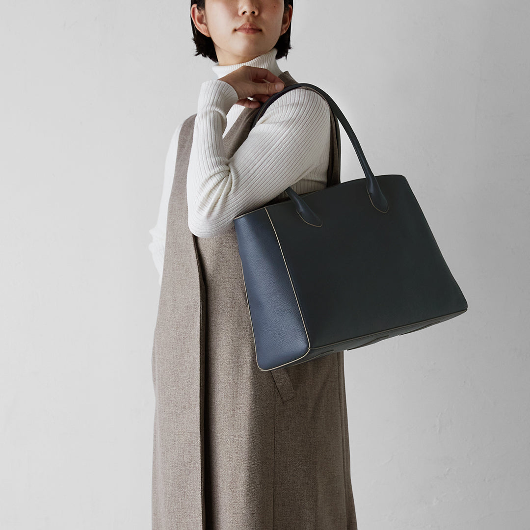 自然なシボ革が生み出す凛とした佇まいが美しい、大容量のお仕事トート。肩かけに余裕のある長さと、手さげにも持ち替えやすいハンドルが、アクティブなビジネスシーンに寄り添います。大きな間口で使いやすく、A4サイズの書類やPCが収納可能です。
