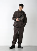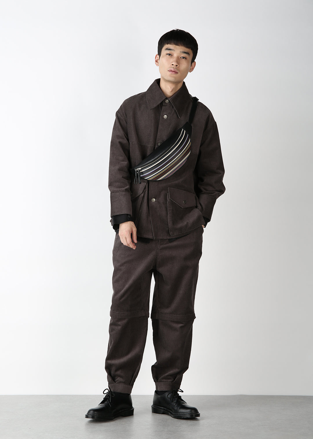 前胴の22本の紐は、長さの異なるレザーパーツで包み込み、すべてを繋ぎ合わせて仕立てています。紐を包むレザーは、生産過程で生まれた端材を再活用しており、一期一会のユニークな配色をお楽しみいただけます。※こちらのカラーは完売しております