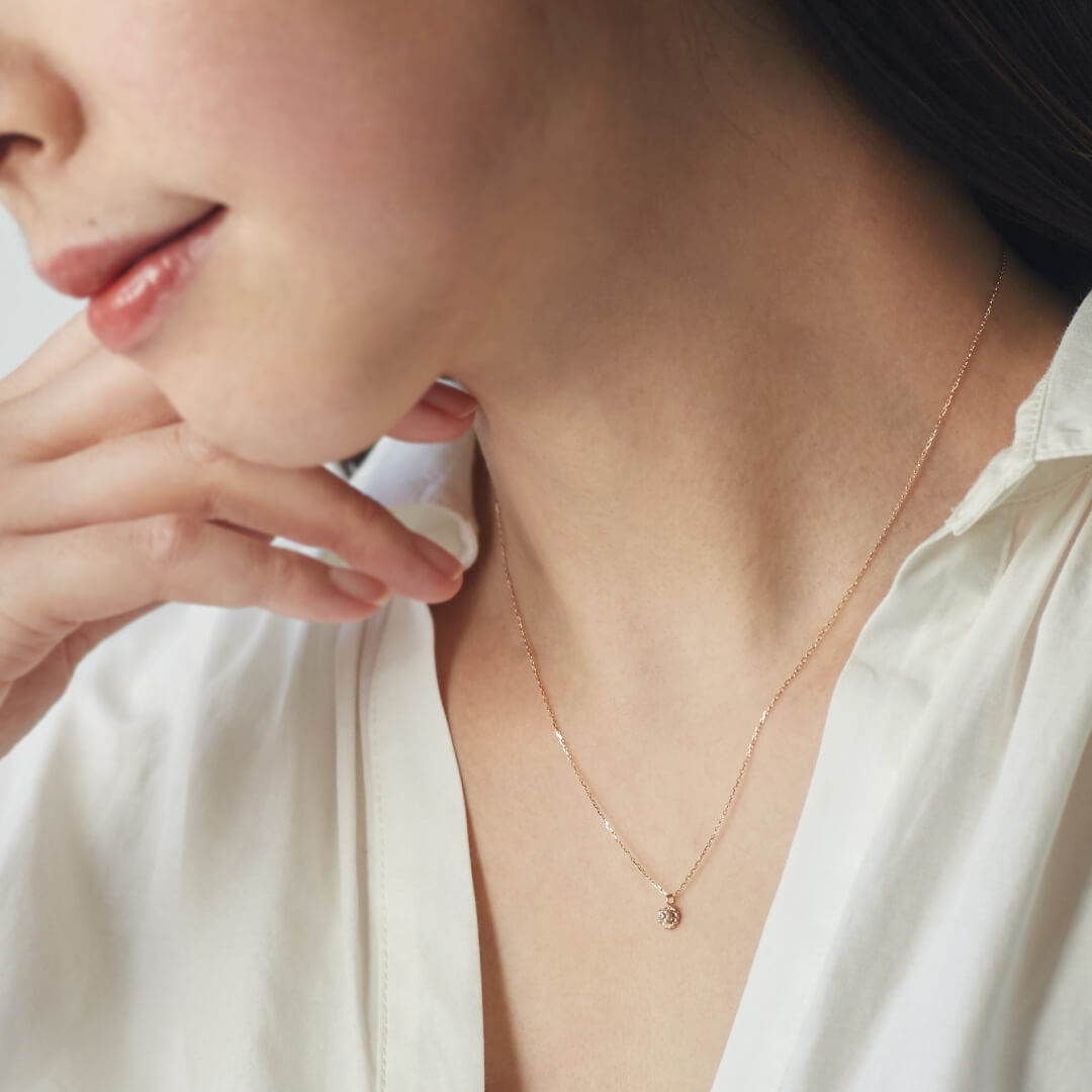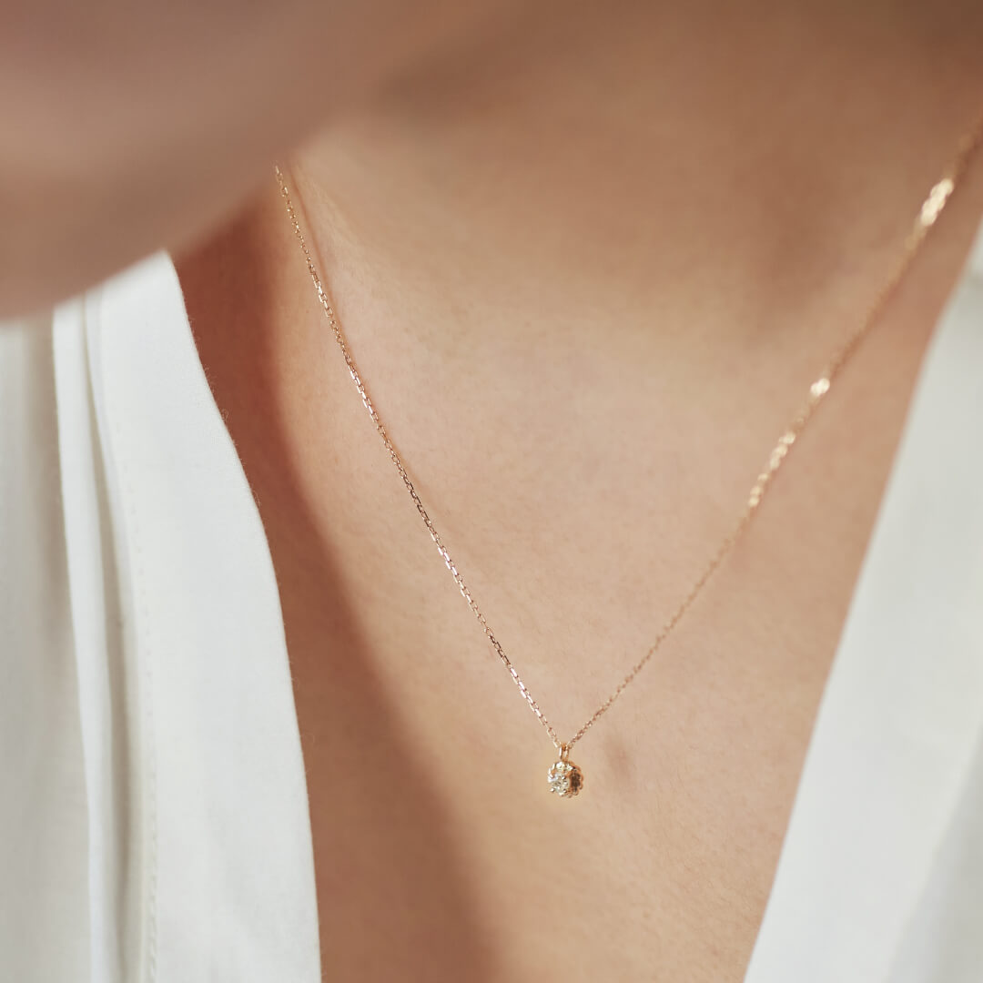 晴れた日に、燦燦と照る太陽を表現したダイヤモンドネックレス、晴陽。ツイストした2本の金線が織りなすゴールドの輝きが、個性豊かなダイヤモンドを際立たせます。ダイヤモンドの煌めきが、さりげなく気分を盛り上げ、胸もとを華やかにしてくれるジュエリーです。