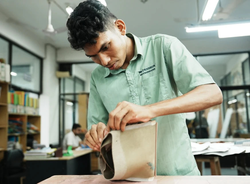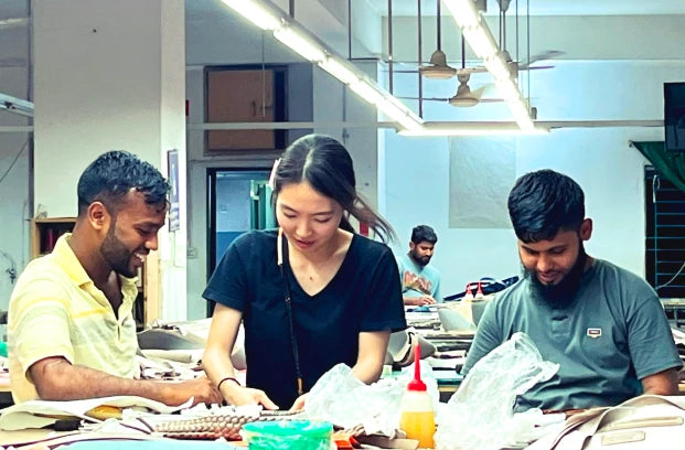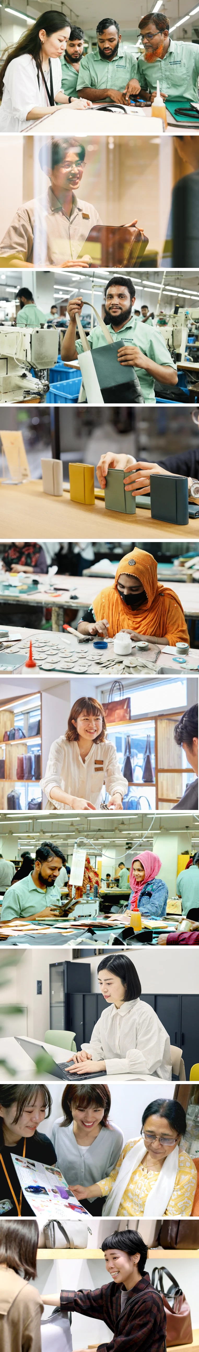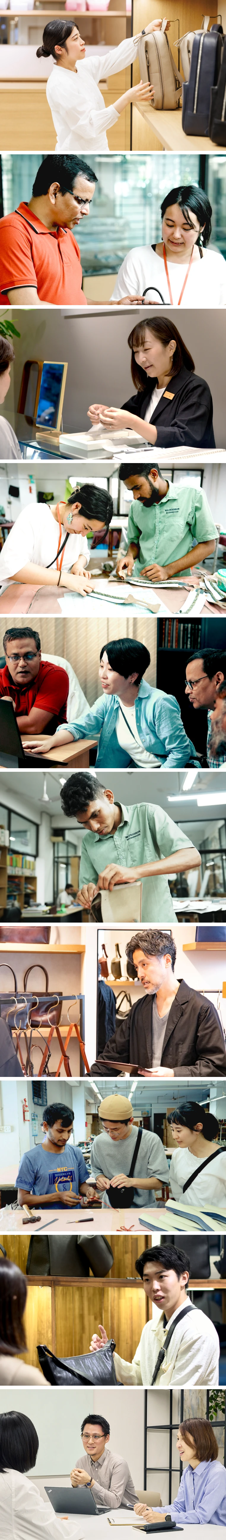地方の店舗にいても、生産地と深くつながれるのがマザーハウスの面白さです。実際にバングラデシュの工場を訪ねたり、現地の職人にリモートインタビューをして革へのこだわりを聞いたり。そうして得た生の声を全国のスタッフと共有し、接客に役立てています。広島にいながら世界を肌で感じられる、この製販一体の仕組みが大好きです。