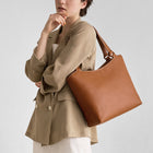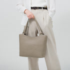 • グレージュ着用(モデル身長:175cm)。斜めに伸びるハンドルとカーブを描いた間口のラインが、心地よく身体にフィットします。