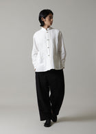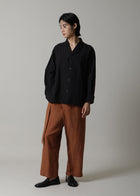 経糸に56番手のカディの糸を1本、緯糸に50番手のリネン糸を2本どりして織りあげた生地です。やや太めの糸のため、リネンの光沢感や、カディの風合いなどそれぞれの素材の良さを楽しみつつ、綺麗めな落ち着いた印象で合わせていただけます。