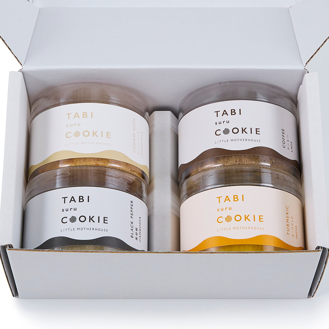 各地の特色ある個性的な素材を活かした「タビスル クッキー」シリーズ。その「タビスル クッキー」の中から、「カシューナッツ」「黒胡椒」「ターメリック」「コーヒー」の4つの味がセットになりました。異なる4つの味の食べ比べや、大切な方へのギフトにもおすすめです。口のいっぱいに広がる素材本来の風味をお楽しみください。
