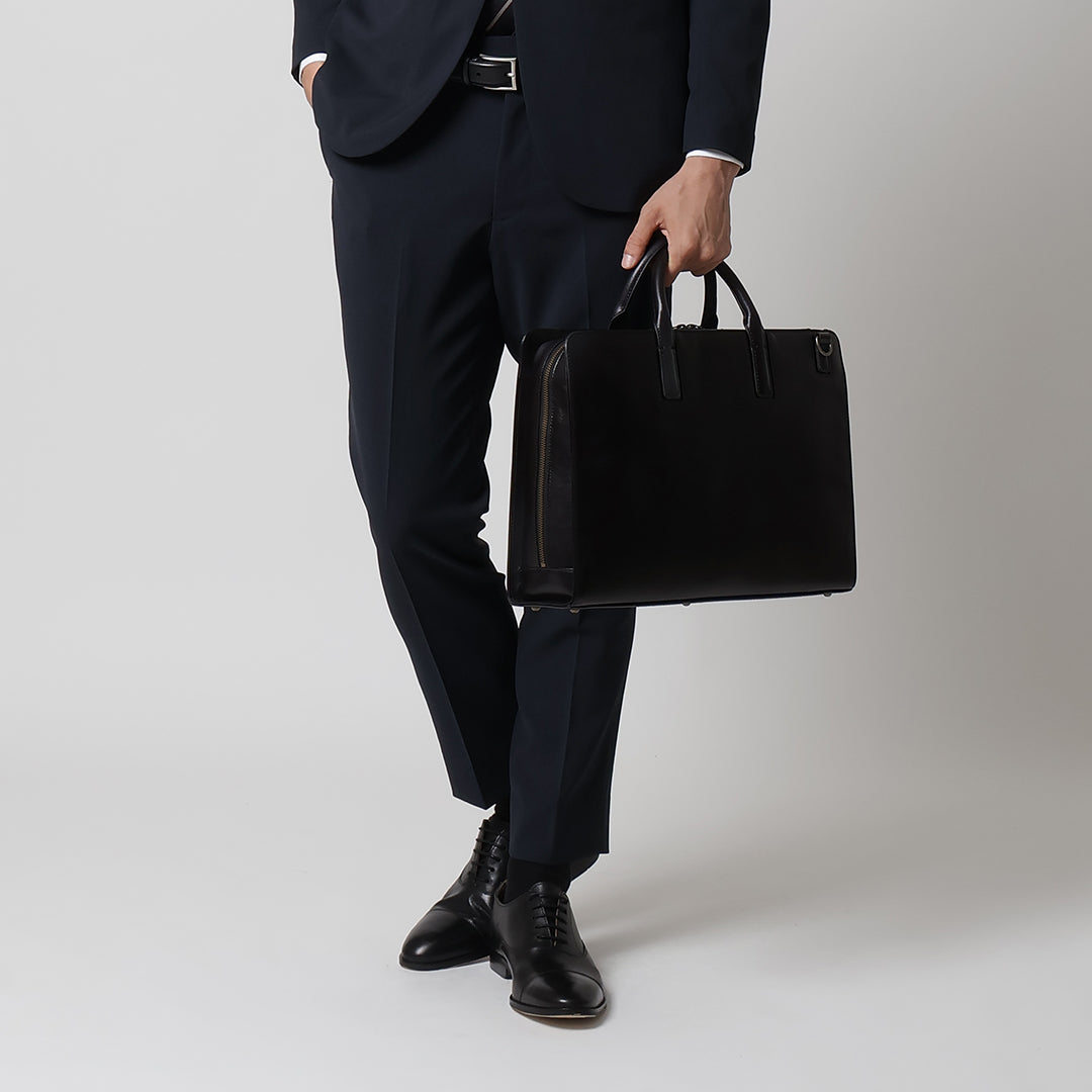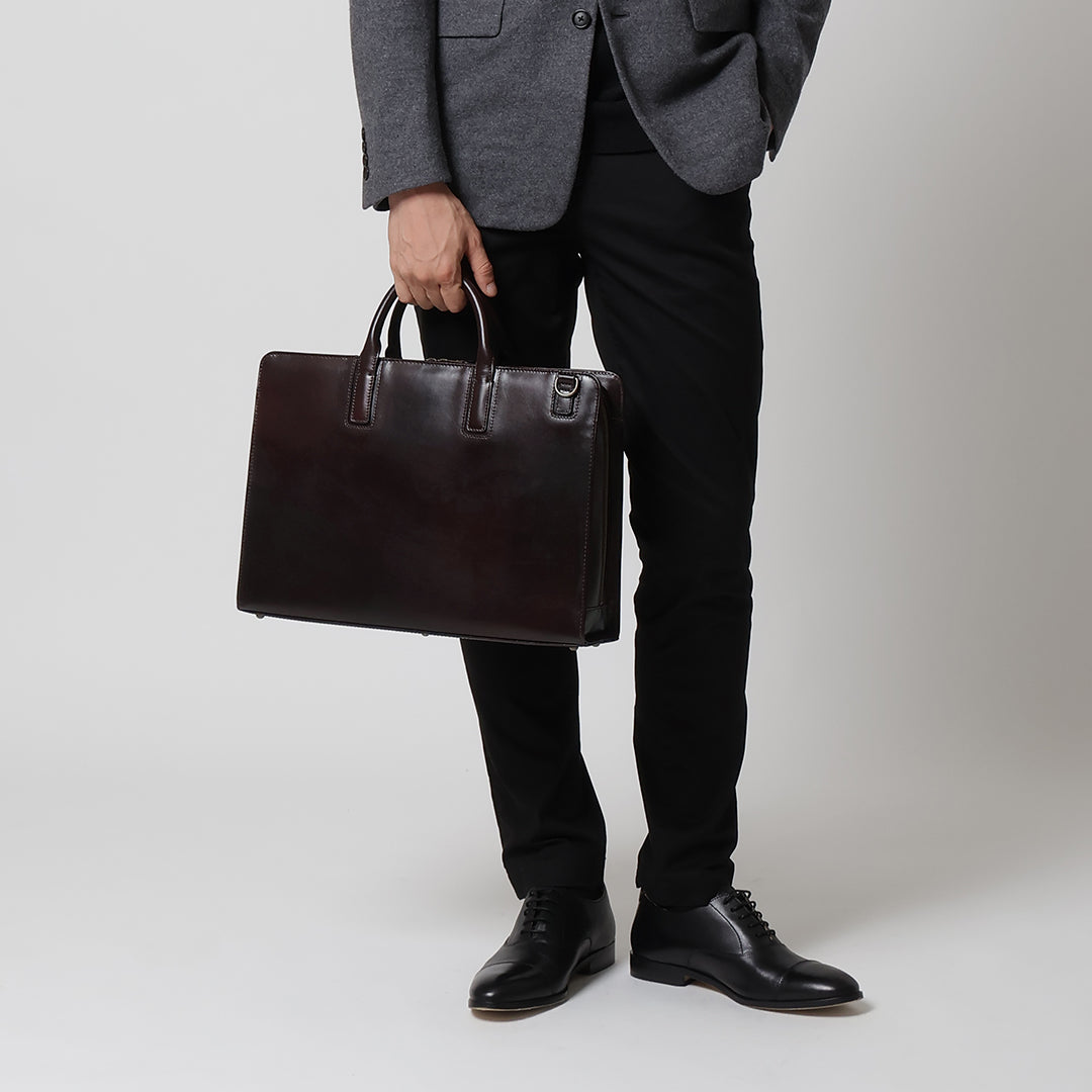 表情豊かなアンティークレザーで仕立てた、スクエアタイプのビジネスバッグ。機能面やフォルムなどの改良を重ね、ビジネスシーンに相応しい、無駄のない凛とした佇まいに刷新しました。A4サイズの書類やPCが収納可能です。
