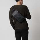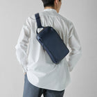 • チャコールブラック着用(モデル身長:187cm)。スリムなフォルムに備わった外ポケットのファスナーは、正面からは見えないすっきりとした佇まい。洋服を選ばずに、気軽に使えるクロスバッグです。