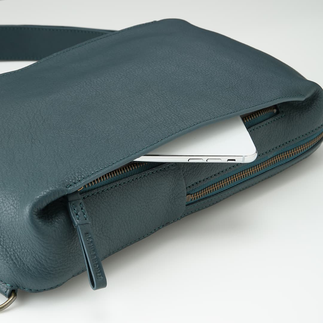 風をまとうような軽やかさと、抜群のフィット感が特徴のクロスバッグ。自然なシボを残したレザーで仕立て、両手を開けて軽快に使えるオフバッグです。スリムなフォルムながら、タブレットや500mlのドリンクボトルが収納可能です。