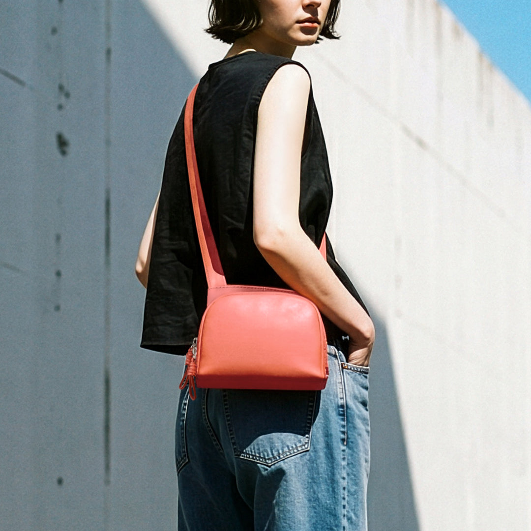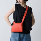 (新色)マンダリンオレンジ着用(モデル身長:169cm)。柔らかなレザーと太めのベルトが身体に沿い、軽やかな使い心地です。