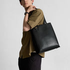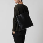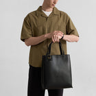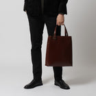 時間をかけてオイルとワックスを浸透させた、艶やかなレザーで仕立てた縦型トート。シンプルなデザインながら、広めのマチと2層構造の仕切りで効率的にアイテムの整理が可能。15インチまでのPCが収納可能で、大きめPCを持ち歩く方にもおすすめです。手持ちと肩掛けの2wayでオンオフ活躍する、ユニセックスなトートです。