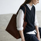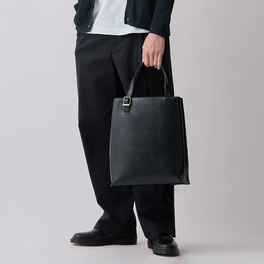 艶やかなレザーが引き立つ、ミニマルなシルエットの縦型トートバック