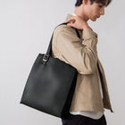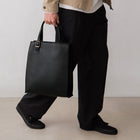 時間をかけてオイルとワックスを浸透させた、艶やかなレザーで仕立てた縦型トート。シンプルなデザインながら、広めのマチと2層構造の仕切りで効率的にアイテムの整理が可能。15インチまでのPCが収納可能で、大きめPCを持ち歩く方にもおすすめです。手持ちと肩掛けの2wayでオンオフ活躍する、ユニセックスなトートです。