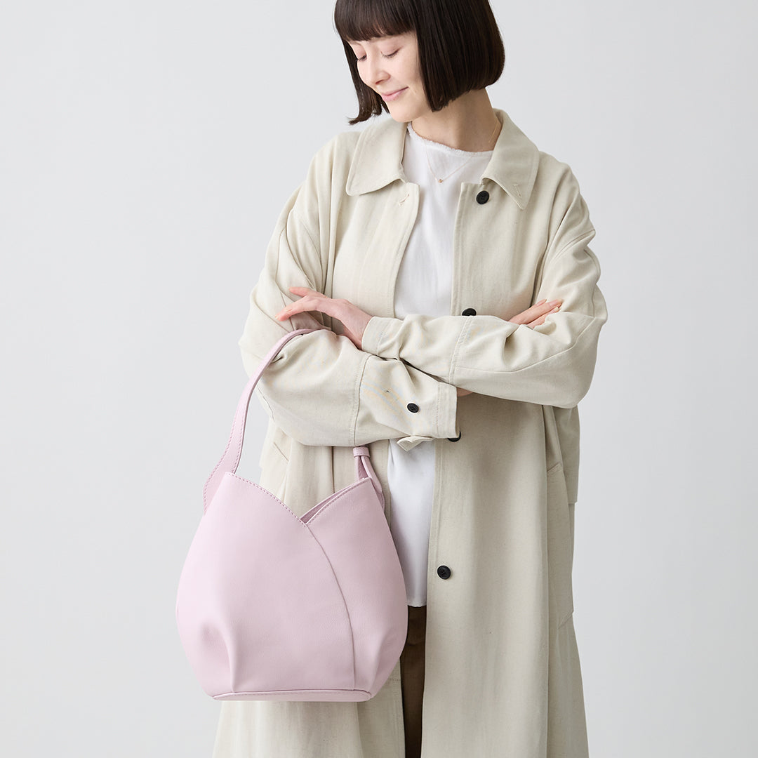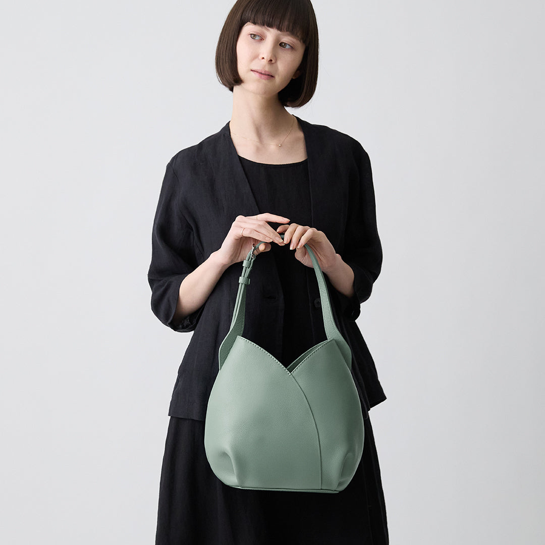 水芭蕉をイメージした、立体的なフォルムとしなやかなハンドルが特徴の小ぶりのオフバッグです。花弁が重なる曲線や、サイドのふっくらとしたフォルム、すっと伸びるハンドルに至るまで、職人の手仕事で細部の美しさを追求し、凛とした優美な佇まいに。長さ調整可能なハンドルで肩掛けワンショルダーとしても、手提げハンドバッグとしてもお楽しみいただけます。