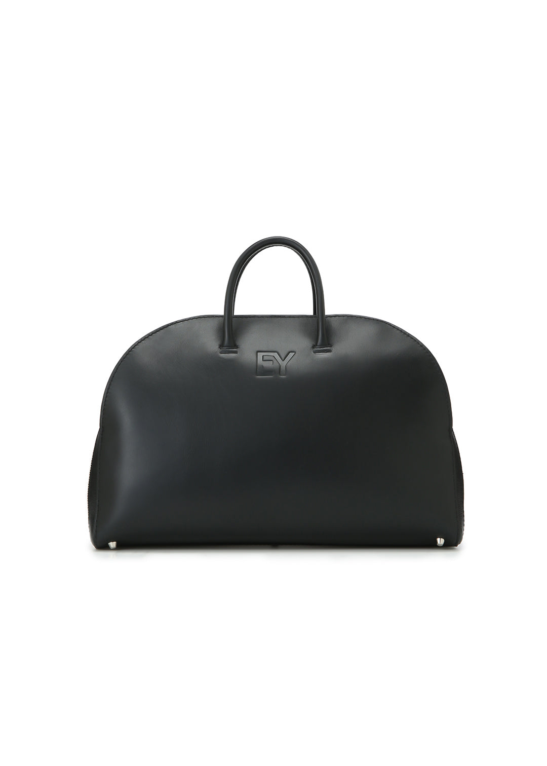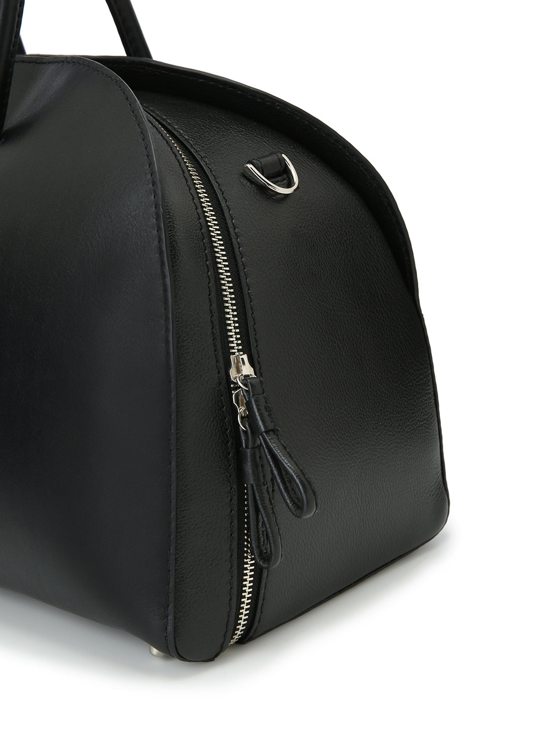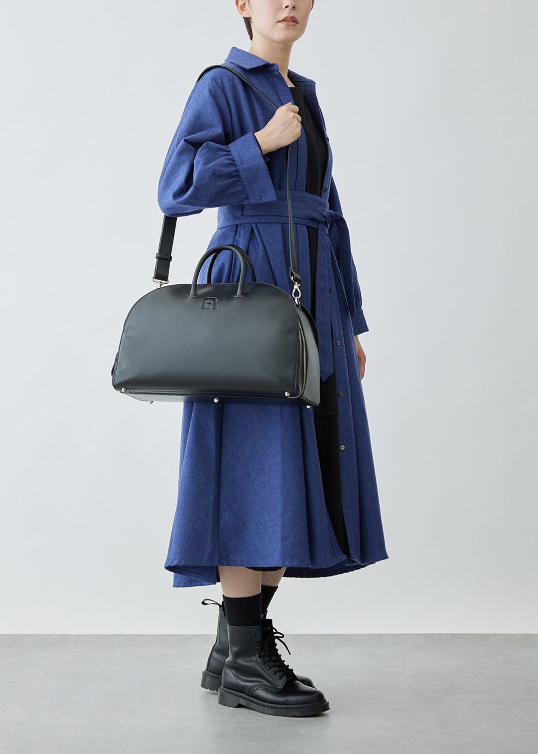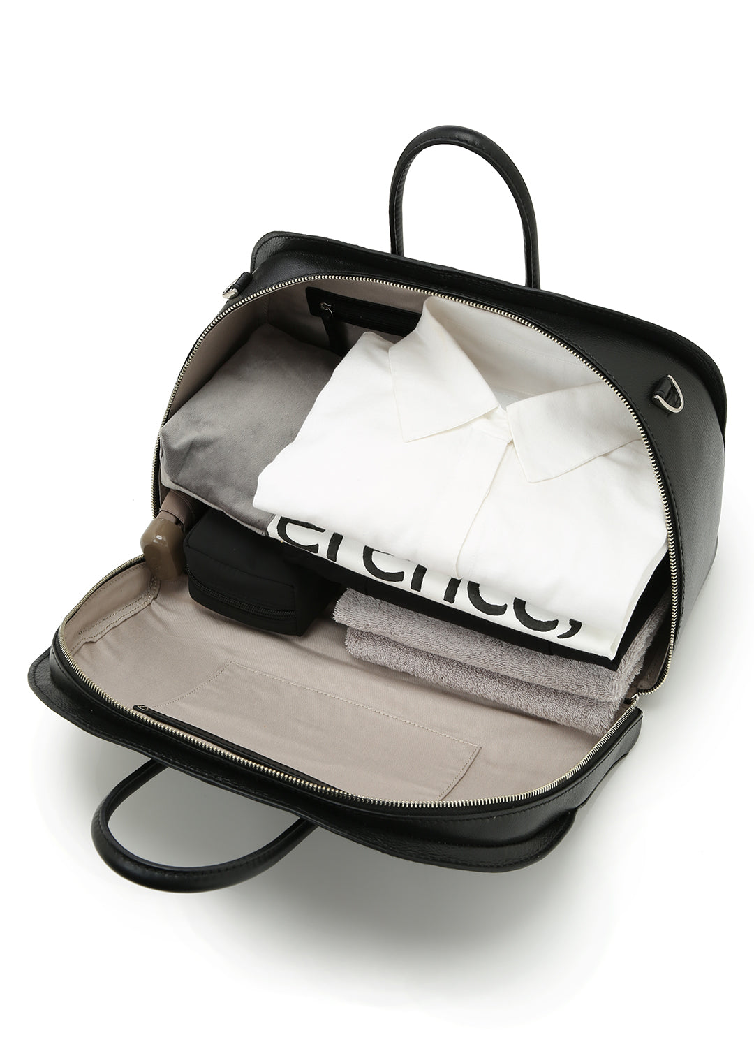 シンプルながらも光沢感のあるレザーが、上品でモードな印象を添えるデザイン。 立体的なフォルムに寄り添った曲線状のファスナーは、間口も大きく開くため、荷物の出し入れがしやすい仕様に。