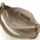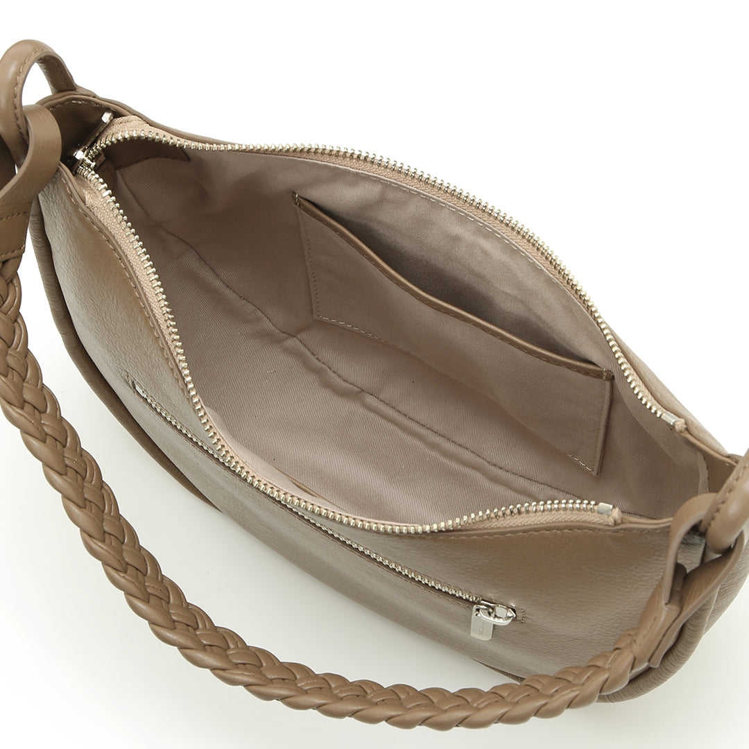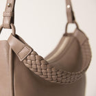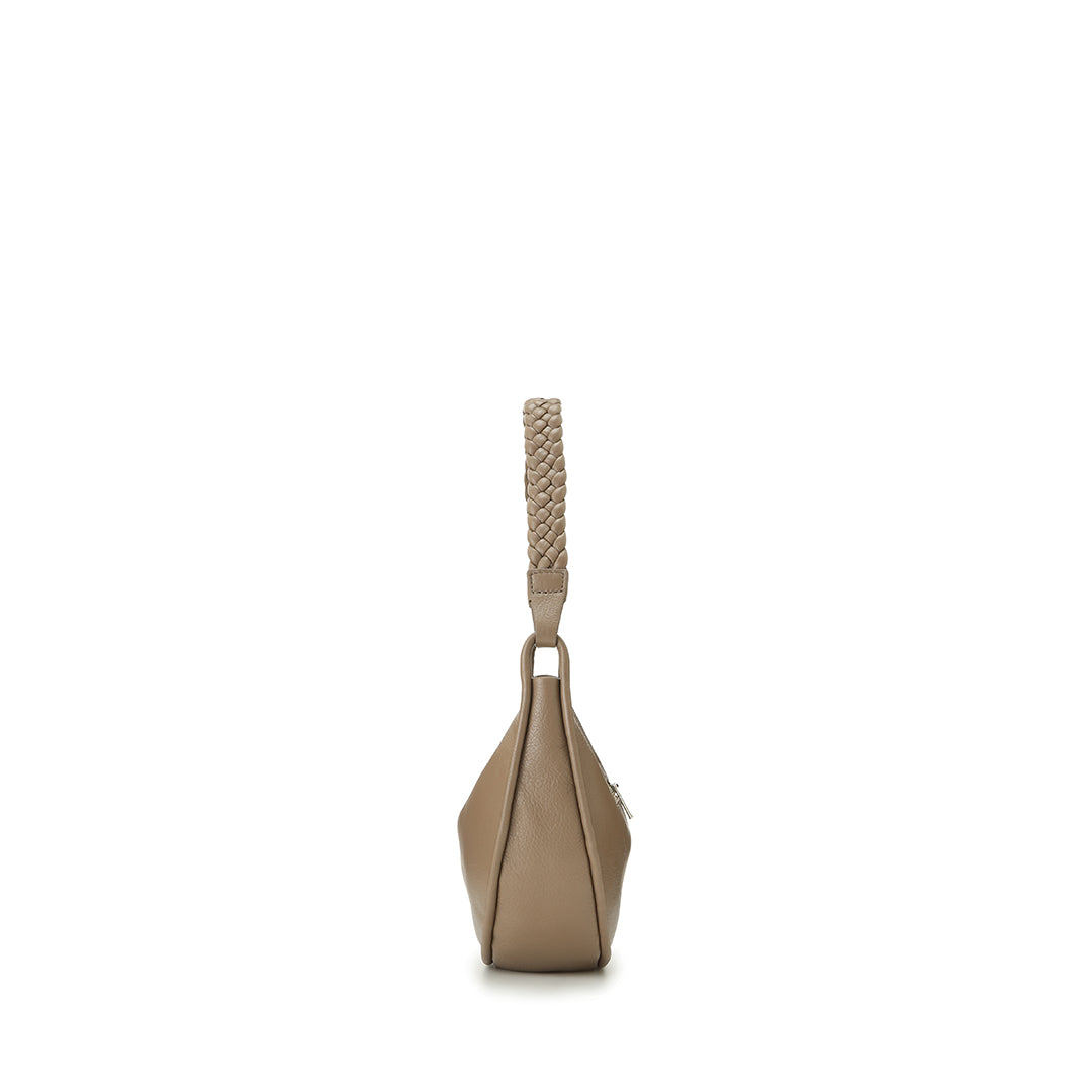 デザインのポイントであるハンドルは、レザーでつくったロープを1本ずつ手仕事で編み込んでいます。 分厚くならないように、編み方やロープの本数など試行錯誤を重ねたことで、バッグの表情を豊かにするだけでなく、肩あたりの良さを生み出しました。ハンドルを前に倒した姿も絵になるように、細部まで手仕事のこだわりが詰まっています。