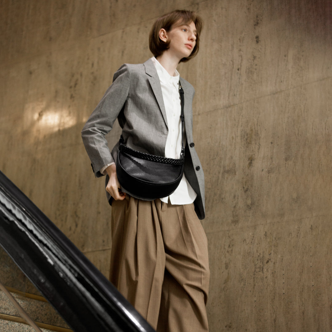マチに沿わせたロープが曲線を描きながら、月のように美しいシェイプをかたちづくります。芯材は使わず、面には薄いスポンジを入れることで軽さを実現。素材の良さを活かした、柔らかなフォルムに仕立てました。日々お使いいただくバッグだからこそ、「装い」と「手や肌に馴染む使いやすさ」を共にお届けします。
