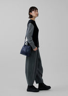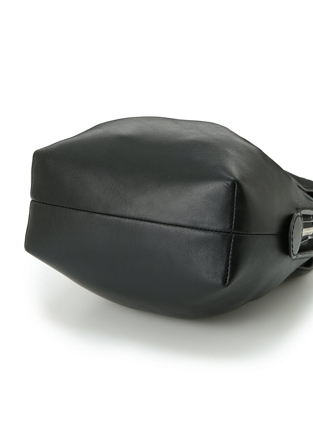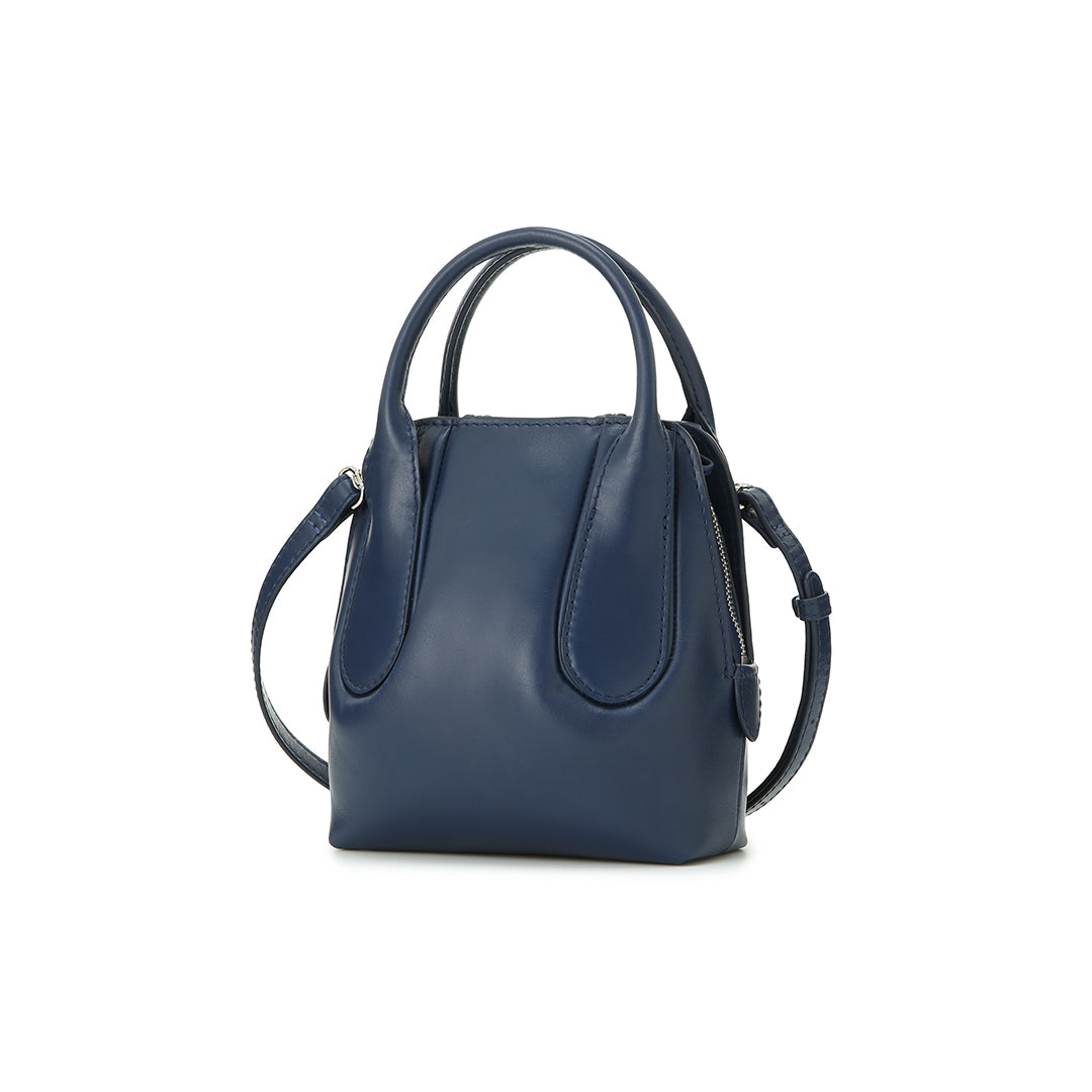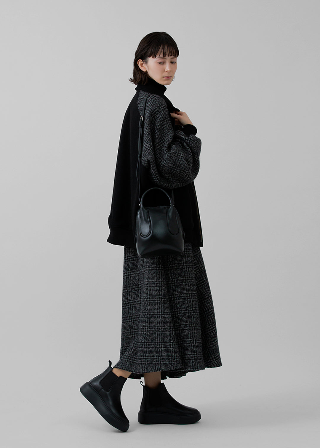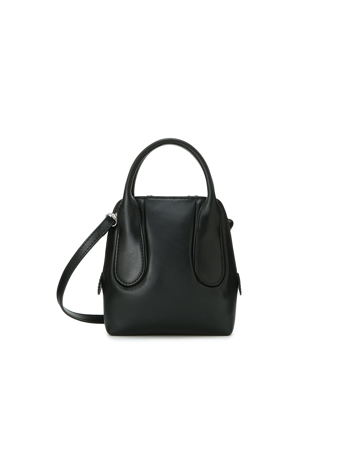 ふっくらとした美しい曲線を活かしつつ、シャープなスクエアフォルムに落とし込むことで、より洗練されたモードな印象に仕上がりました。ハンドル下の立体的な曲線や、正面からは見えないよう配慮されたファスナーなど、細部にわたる職人の手仕事が光ります。スマートフォンや折り財布などの必要最低限の荷物を軽やかに収納でき、実用性も兼ね備えています。