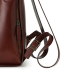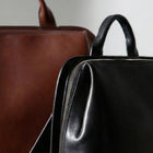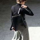 濃淡が魅力のレザーを主役に、マチの三角形フォルムと上部のタックで有機的なシェイプを形づくりました。上部にかけて厚みを抑えた設計が、荷物を入れた際も膨らみすぎずスマートなラインを維持し、後ろ姿を美しく演出します。内装には折り畳みできるボトルホルダーを備え、使い心地も追求。14インチのPCが収納でき、オンオフ問わず活躍します。