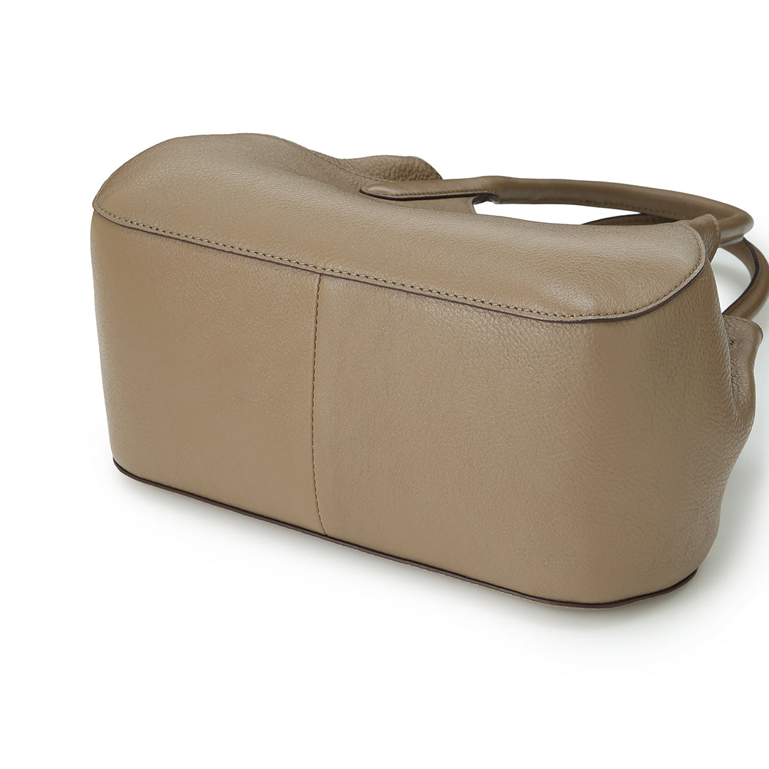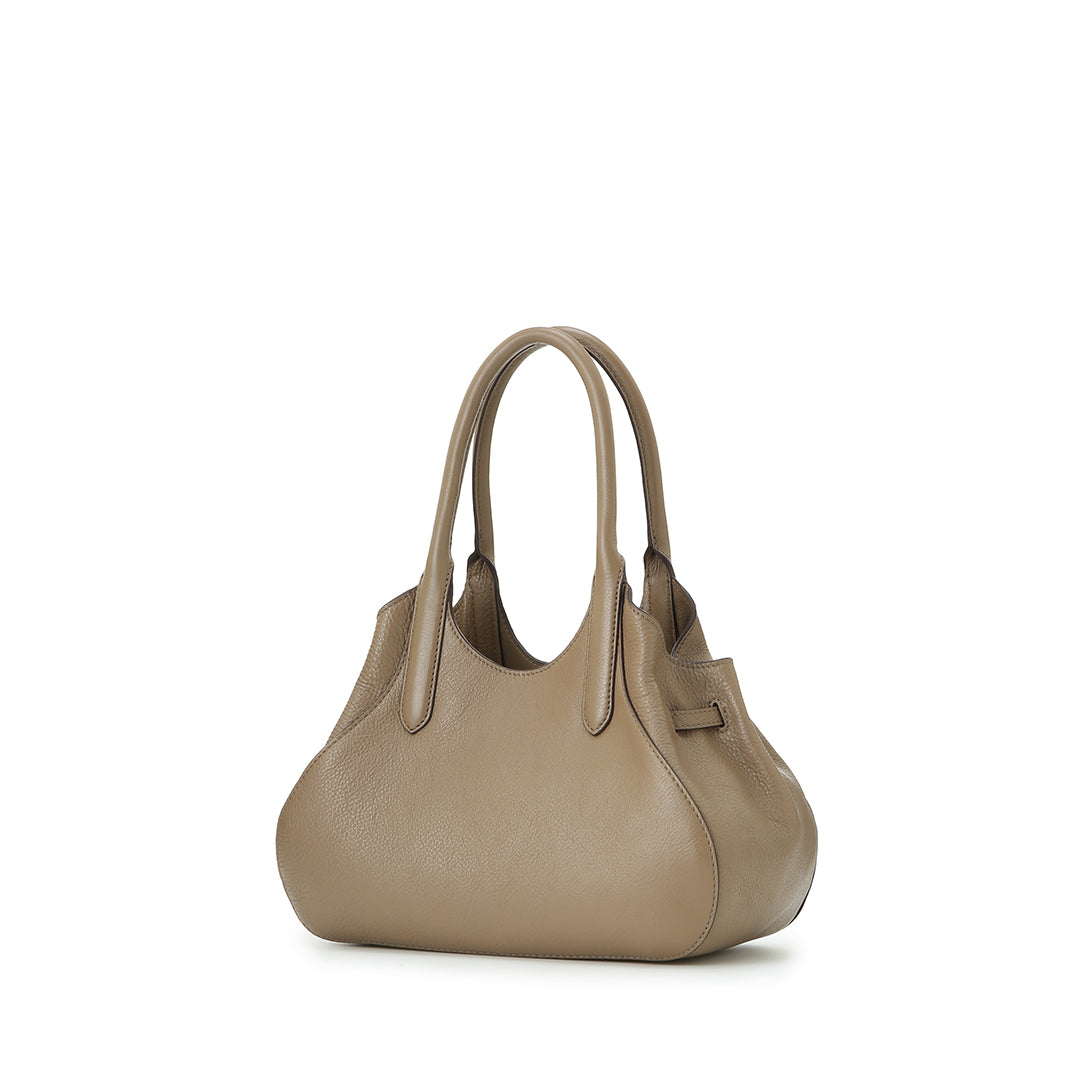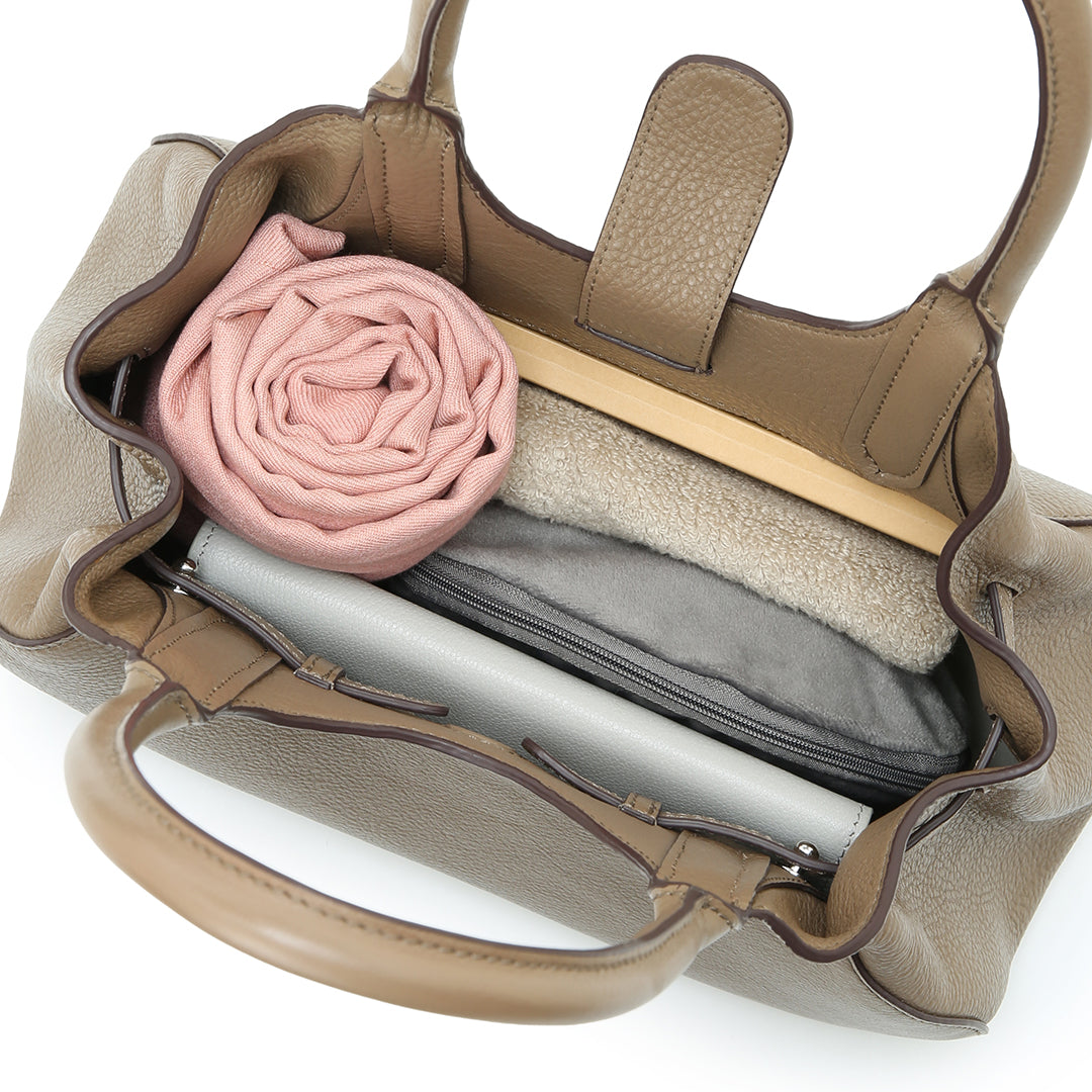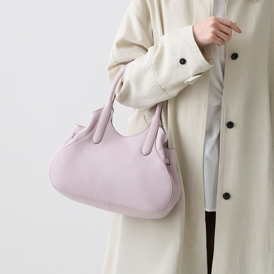 モモ ハンドの最大の特徴は、マチのギャザーが作り出す、ふっくらとした愛嬌たっぷりのフォルム。サイドのベルトを調整することで、ふんわりとした立体感を出したり、絞って重なりを強調したり。持つたびに愛着がわく、表情豊かなデザインに仕上げました。その日のコーディネートや荷物の量に合わせて、フォルムを変えてお楽しみいただけます。