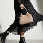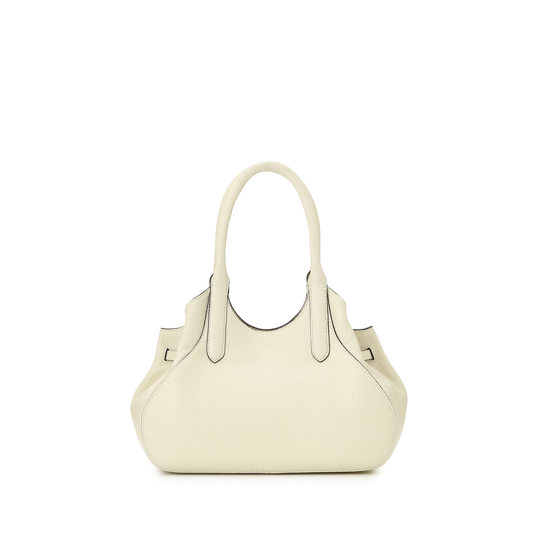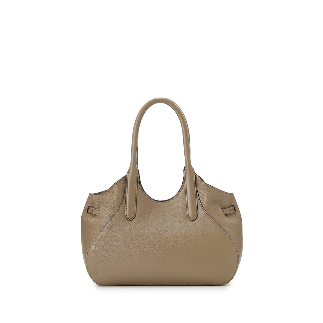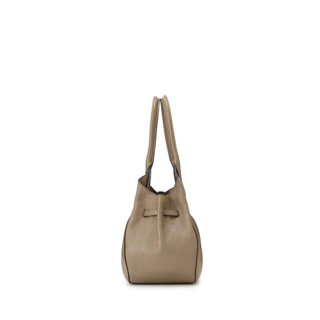 モモ ハンドの最大の特徴は、マチのギャザーが作り出す、ふっくらとした愛嬌たっぷりのフォルム。サイドのベルトを調整することで、ふんわりとした立体感を出したり、絞って重なりを強調したり。持つたびに愛着がわく、表情豊かなデザインに仕上げました。その日のコーディネートや荷物の量に合わせて、フォルムを変えてお楽しみいただけます。
