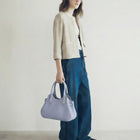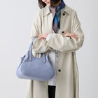 ころんと愛らしいフォルムと、コントラストの効いたコバ塗りが目を惹くハンドバッグ。ベルトを調整してマチのギャザーを寄せたり広げたりすることで、その日の気分に合わせて、バッグのフォルムを変えて楽しめます。コンパクトな見た目ながら、500mlペットボトルが横向きに収まり、必要なアイテムをしっかり収納。春らしい爽やかなカラーが、日々のお出かけを軽やかに彩ります。