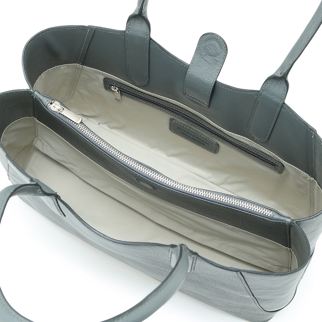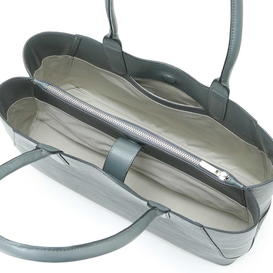 シボ革のしなやかな風合いと、コントラストを効かせたコバ塗りが凛とした佇まいを演出するトートバッグ。中央の仕切りを底に固定しない三層構造により、お弁当箱など厚みのあるアイテムもスマートに収まります。15インチのPCが収まる頼もしいサイズ感と、ビジネスシーンにも馴染むベーシックなカラー展開で、オンオフ問わず日々の装いに寄り添います。