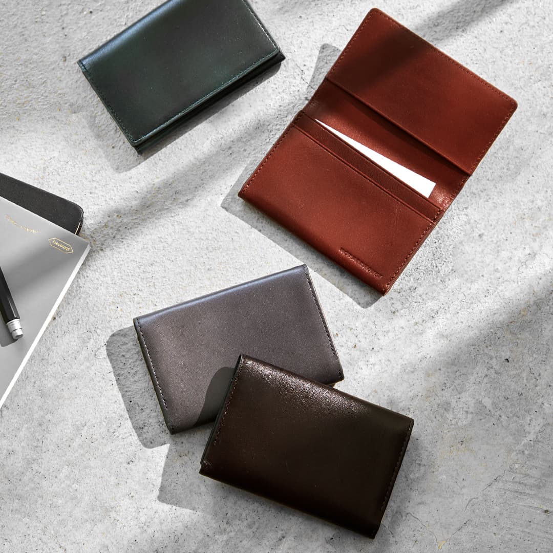 一つ一つ異なる濃淡で、表情豊かなアンティークレザーで仕立てた、カードケースです。手に馴染むふっくらと美しいシェイプが特徴。豊富なカラーバリエーションとビジネスシーンに寄り添うカードケースは、ギフトにもおすすめです。
