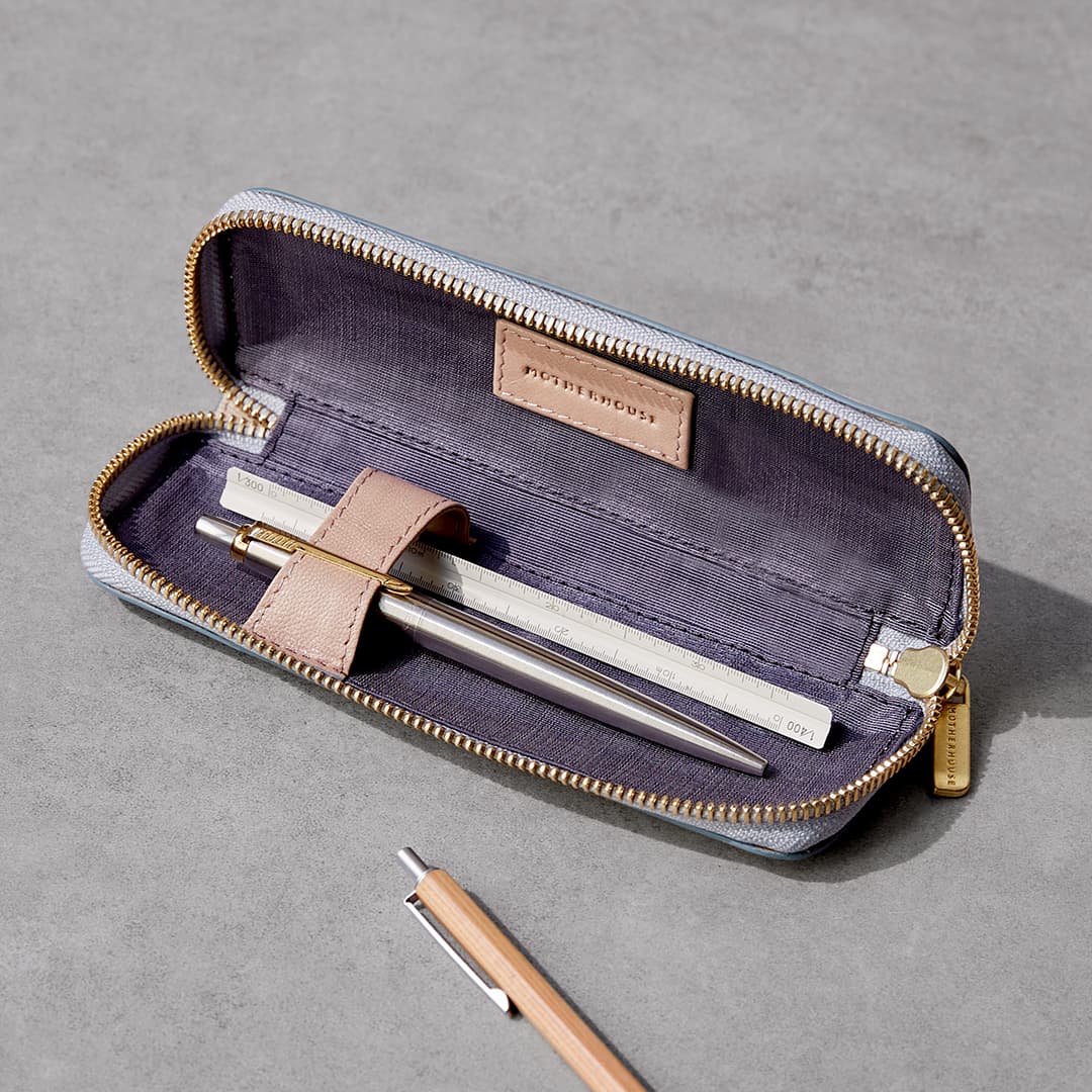 • 中に帯がついているため、クリップ式のペンは固定して収納することも可能に。細めのペンが3本程度収納でき、消しゴムなどの文具も入れていただけます。薄マチでバッグやポーチにもすっきりと収納でき、持ち運びやすいアイテムです。