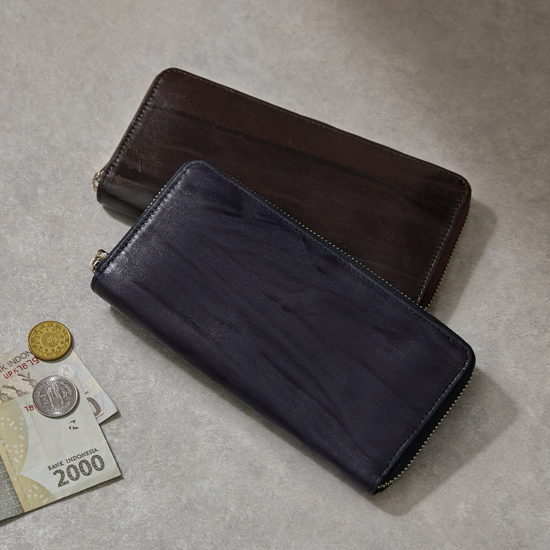 水面のように、光り輝く革の表情を愉しむ。シンプルなラウンド型長財布
