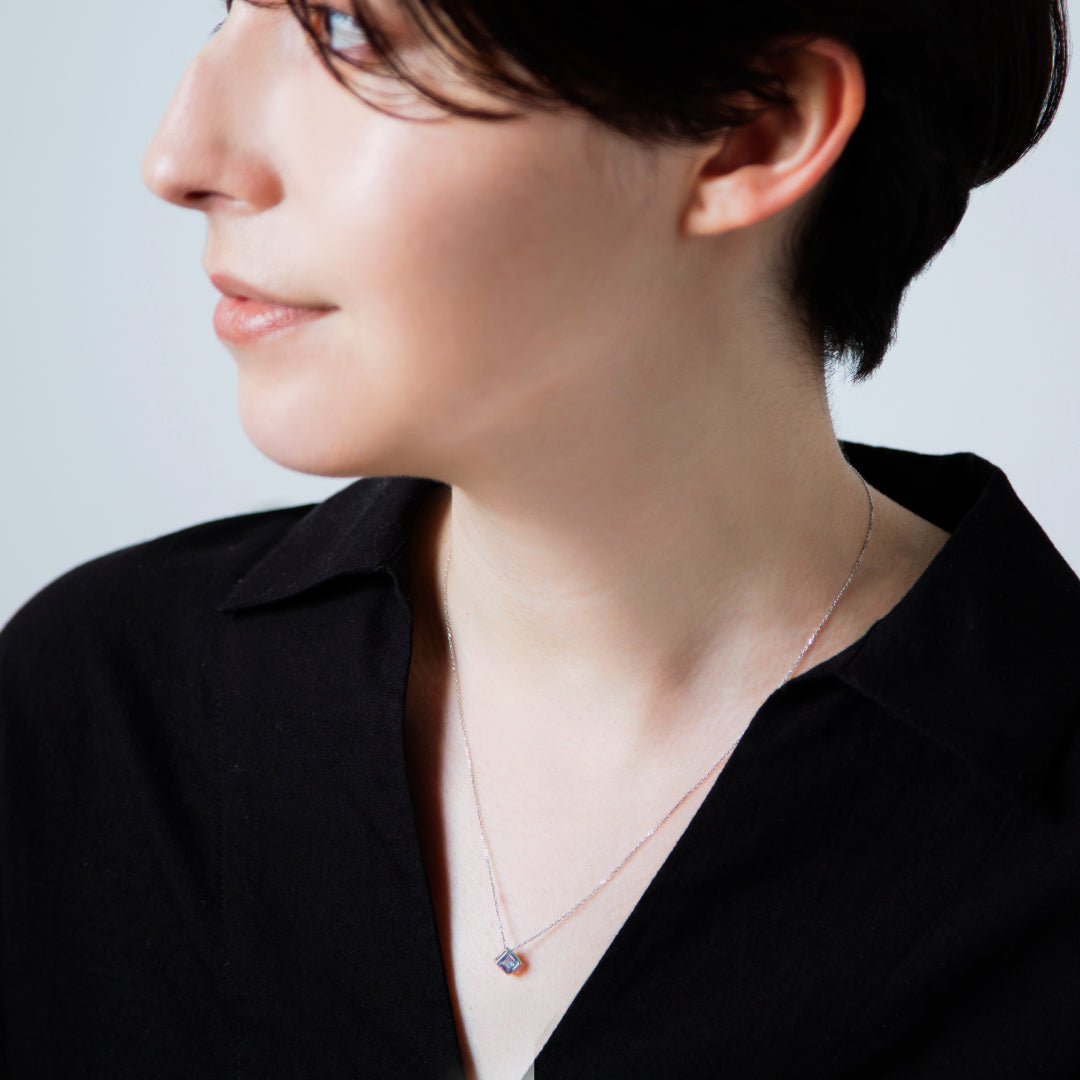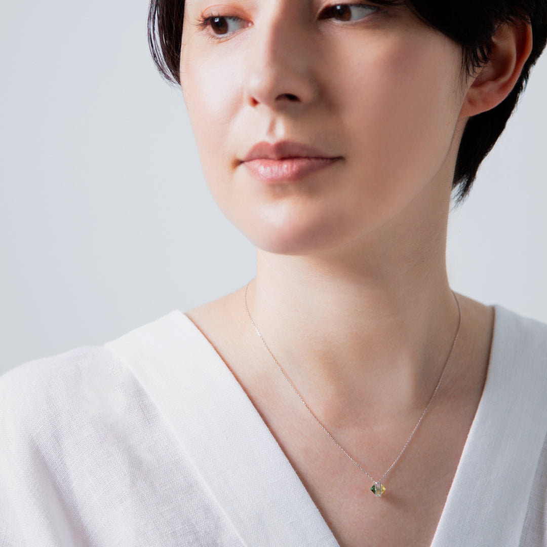 両面に2つの天然石が合わさる“Day and Night Square”。その日の気分やスタイリングに合わせて表に出すストーンを変える事が出来ます。また、チェーンの通す位置を変えることで、ひし形のモチーフとスクエアモチーフと両方のつけ方を楽しんでいただけます。