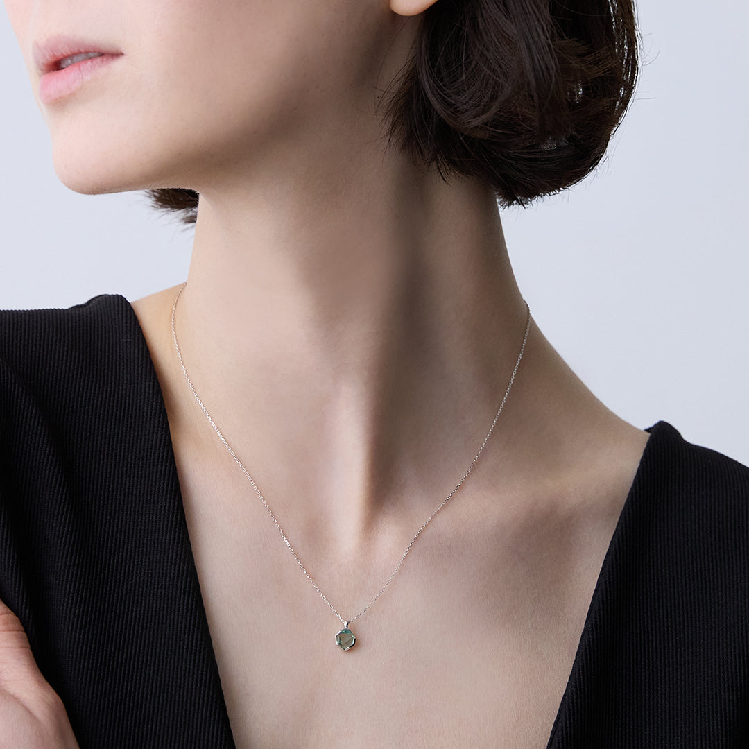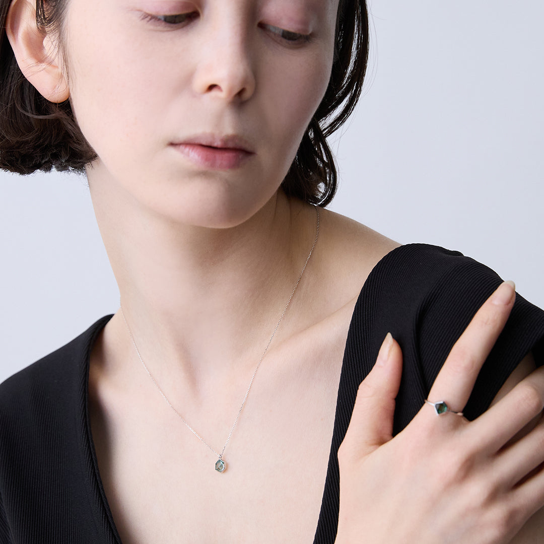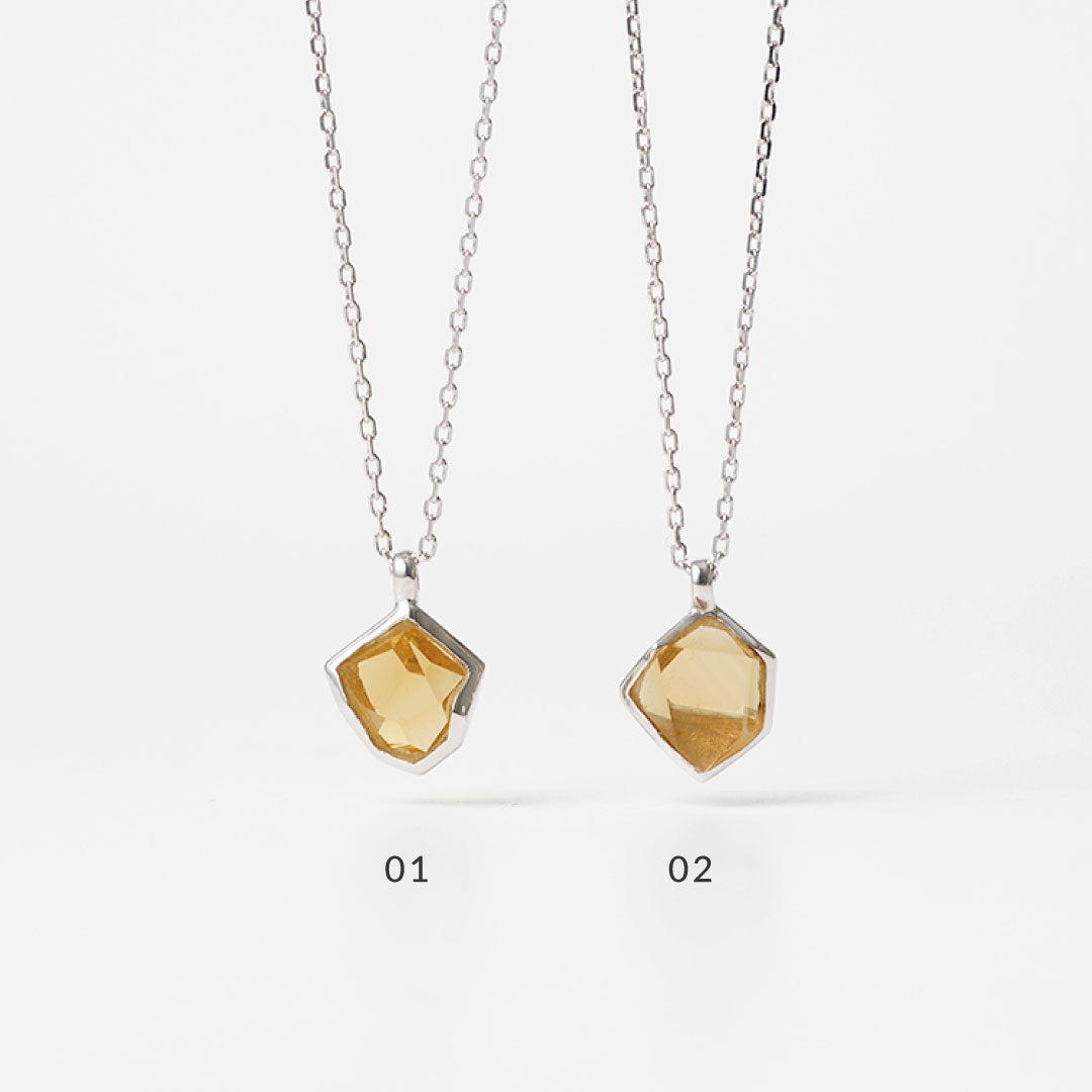 多面的な表面が光を受け、胸元で立体感のある表情を見せてくれます。シックな装いに馴染む深みのあるトーンから、夏の光に映える軽快な色合いまで。ピアスやリングとのセット着用で、さらに奥行きのある魅力的な表情が広がります。(モデル着用|ネックレス:シトリン、ピアス:シトリン)