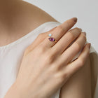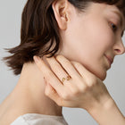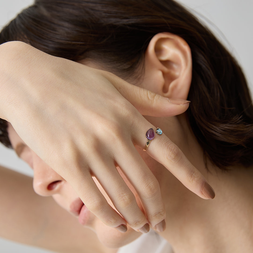 指もとにしずくが滴る瞬間を、天然石の色彩で表現したShizukuリング。やさしく包み込む2つの天然石のコントラストが、お手もとをすっきりと魅せながら、透明感溢れる輝きを放ちます。