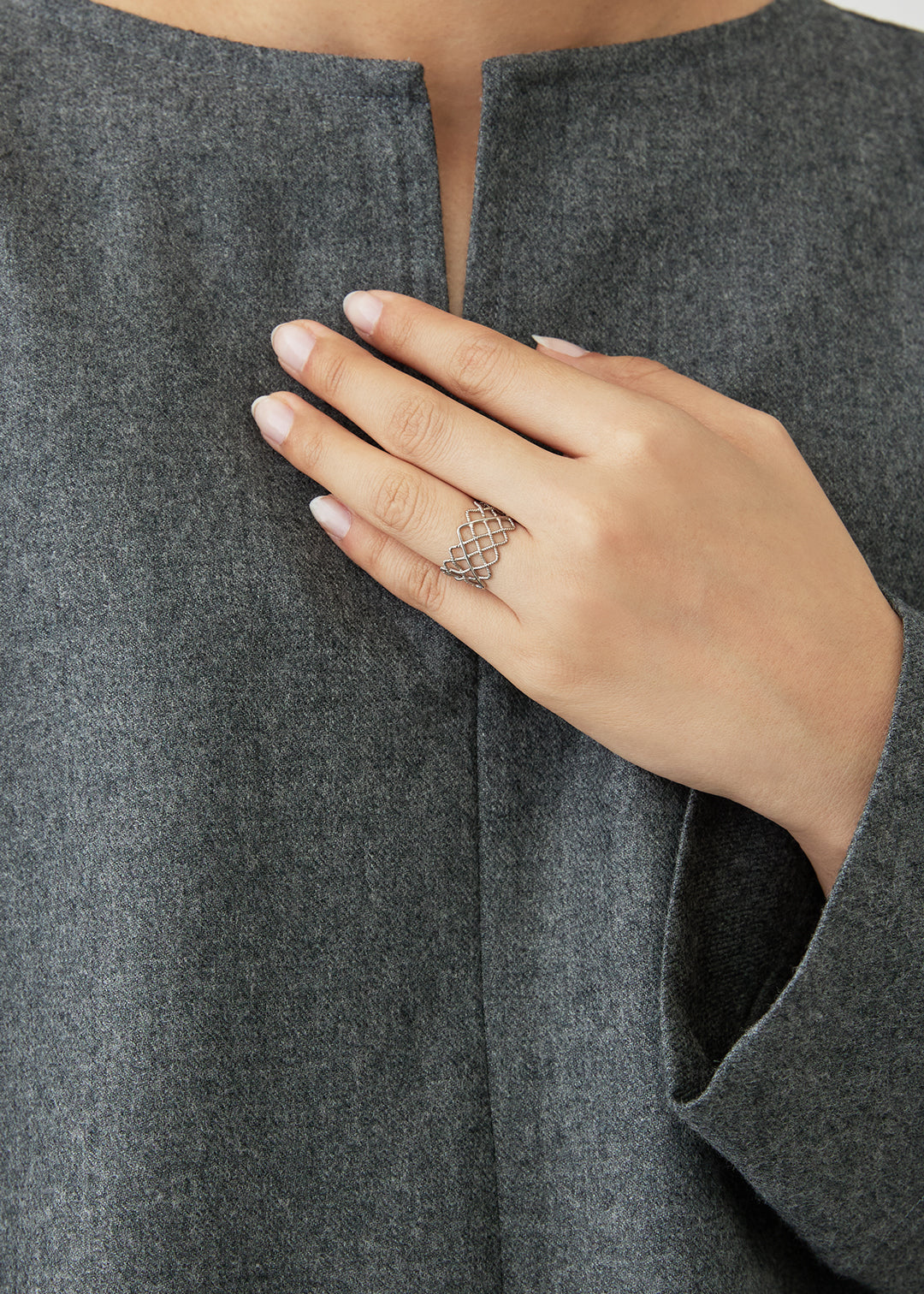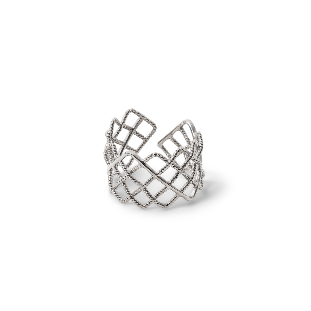 繊細な格子模様は、インドネシアの職人が手仕事で1本1本仕上げたもの。 細い2本の銀線を1本に結いあげた"フィリグリー線"に、あえてプレーンな銀線を組み合わせ、よりシャープな表情に仕立てました。