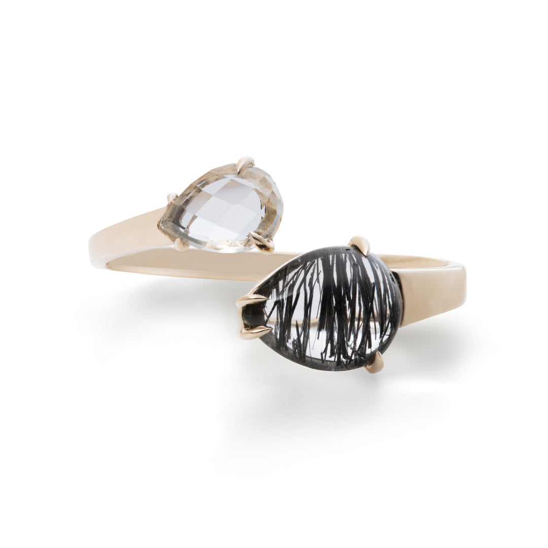 指もとにしずくが滴る瞬間を、天然石の色彩で表現したShizukuリング。ルチルの結晶が内包されている希少なブラックルチルクォーツと、さまざまな角度から煌めく細かなファセットカットを施したホワイトクォーツを合わせて。透明感溢れるモノトーンな組み合わせが、お手元に洗練された輝きを添えるジュエリーです。