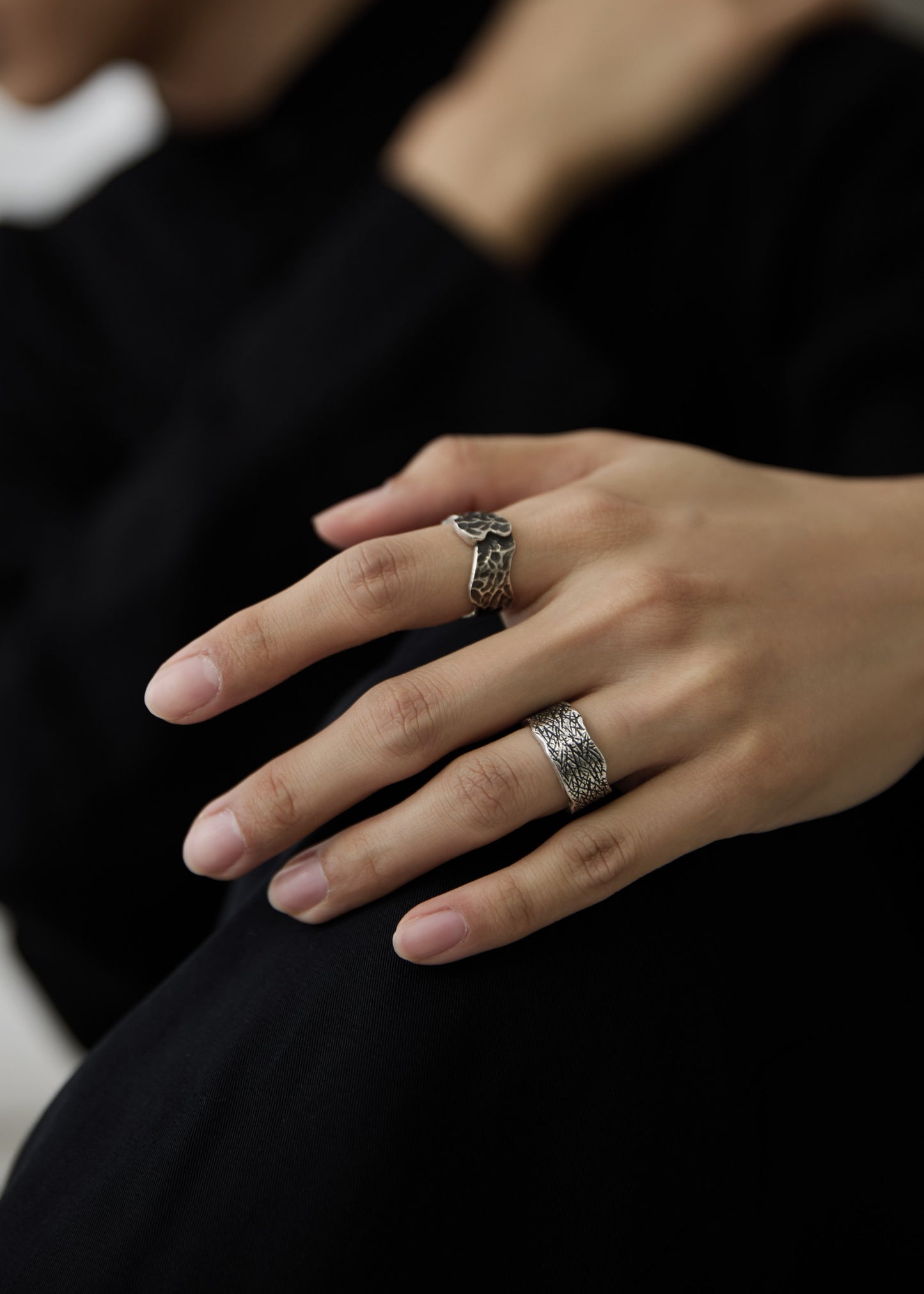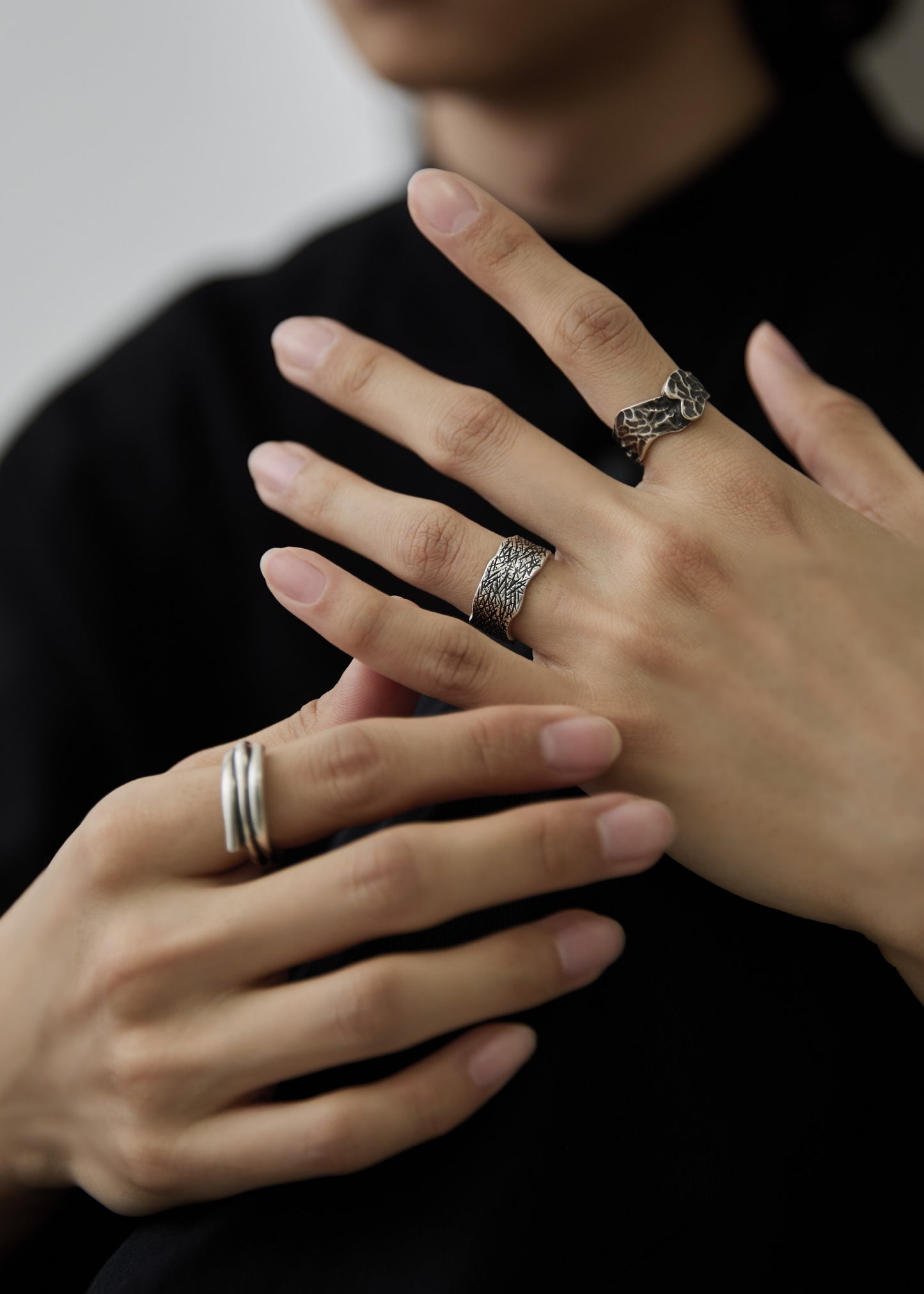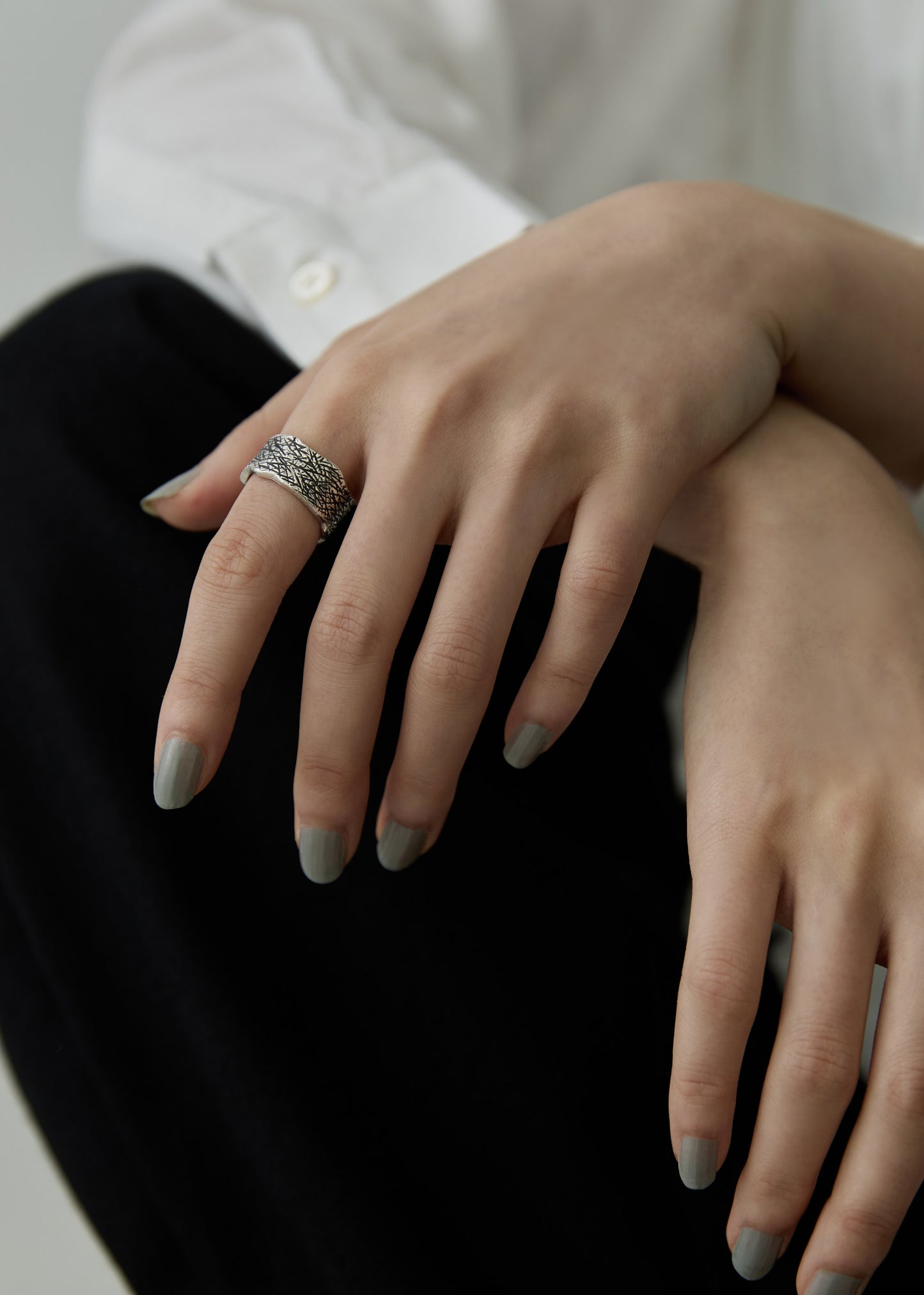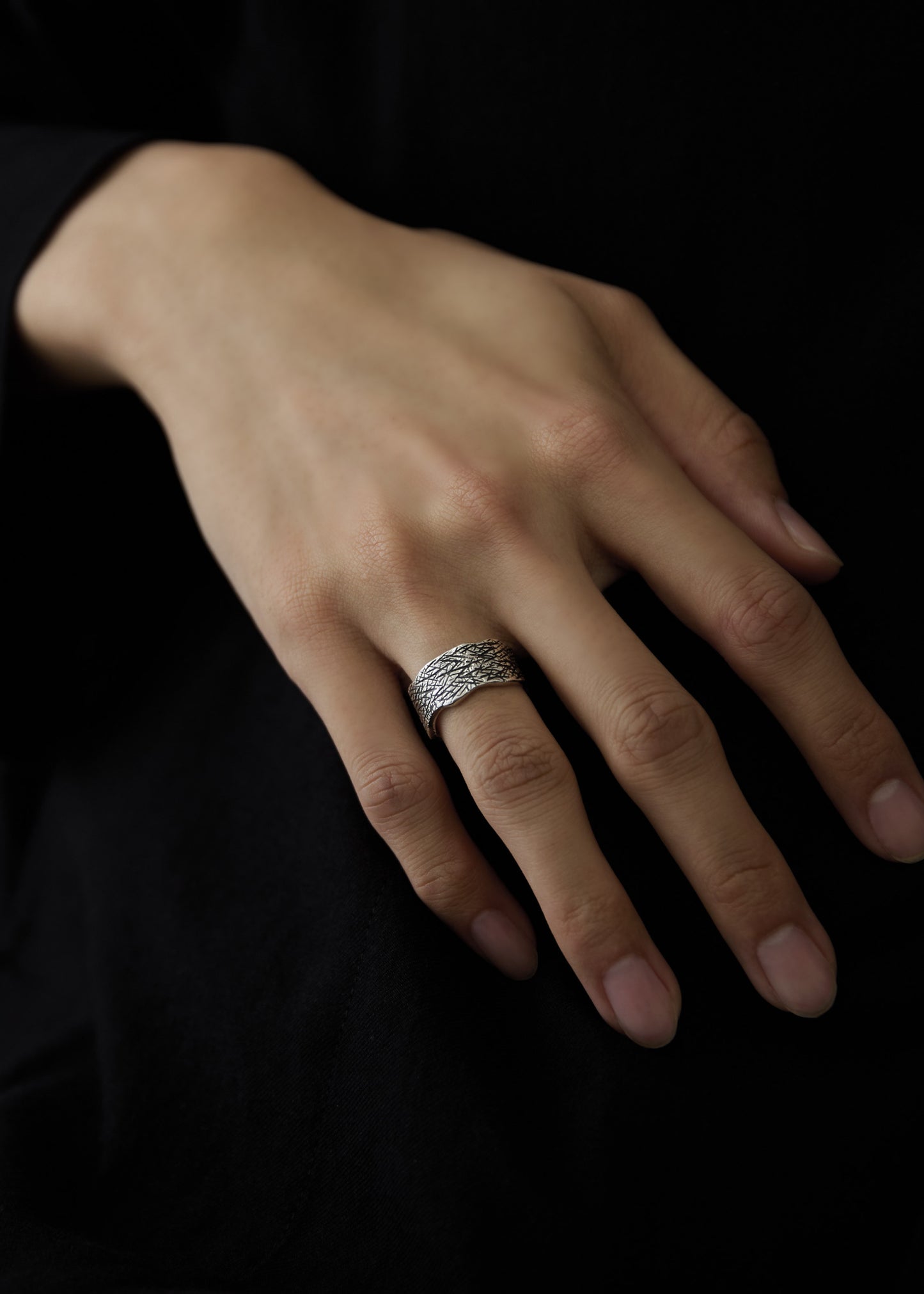 シルバー着用。手元に存在感と個性をそえるリングは、表面の光沢感が抑えられているため、落ち着いた印象で着用いただけるも魅力です。