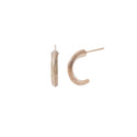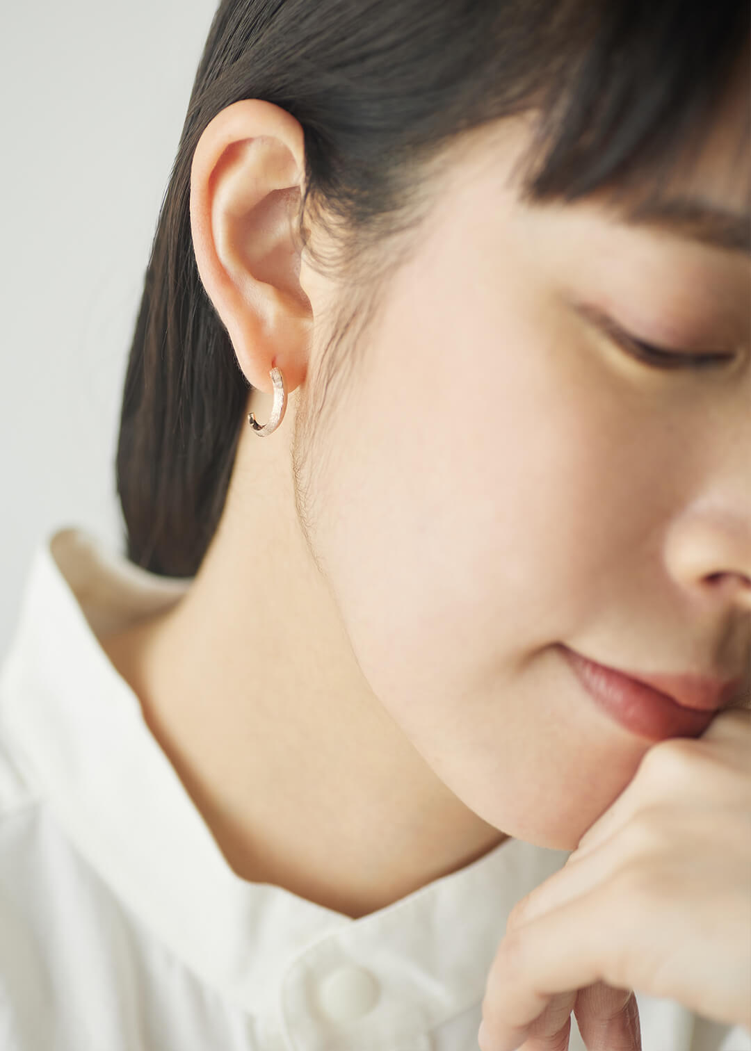 職人が手仕事で叩き加工を施した、シンプルさの中に個性が光るジュエリーです。目をひく存在感はありつつもエレガントな印象をそえる、細さ・丸み・テクスチャーの細やかさのバランスを追求しました。片方のピアスの左側・右側であえて叩き模様を変えているため、見る角度によってニュアンスも繊細に変化。熟練の職人の技術ならではの、手仕事の美しさをお楽しみください。