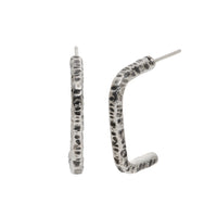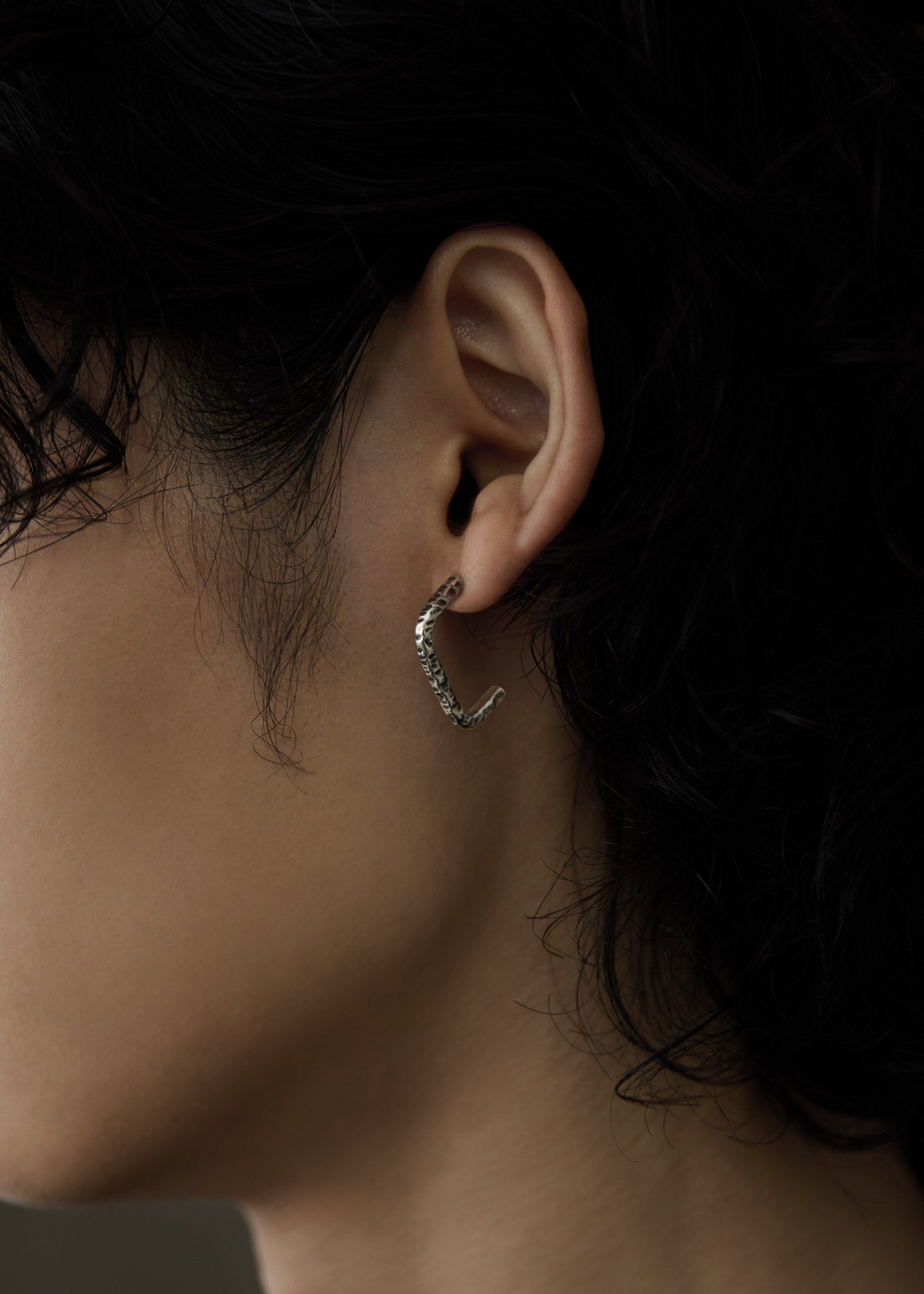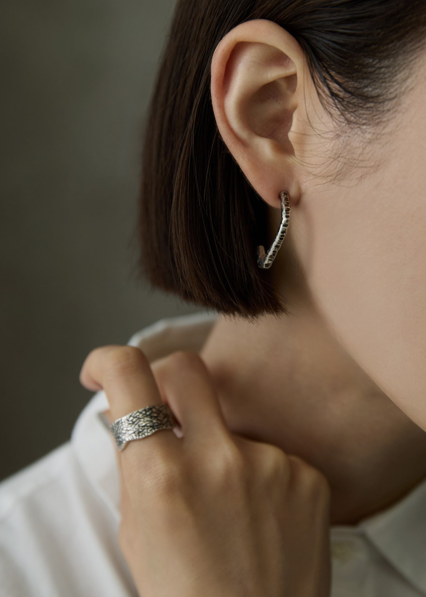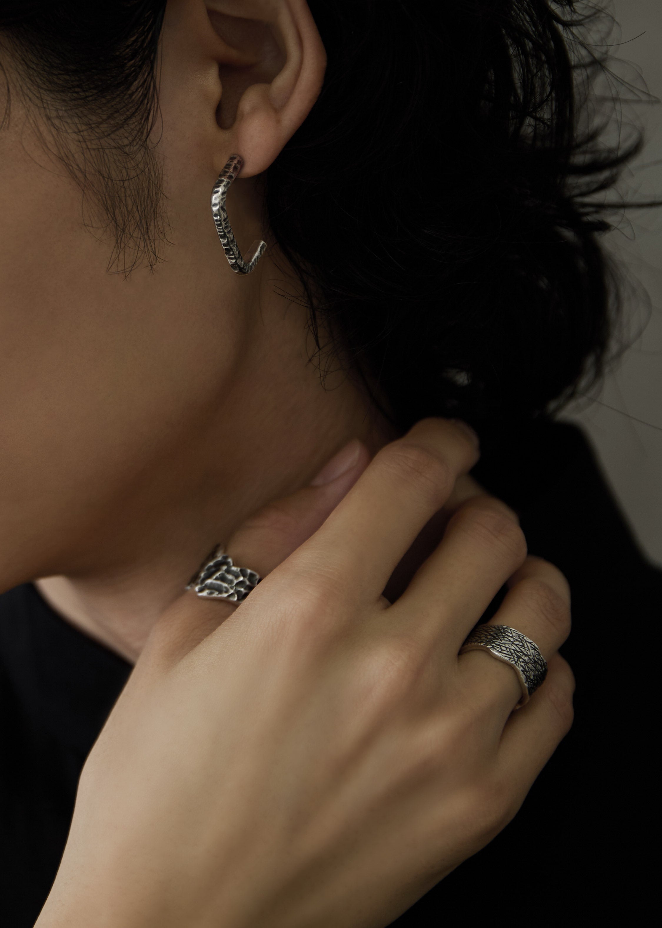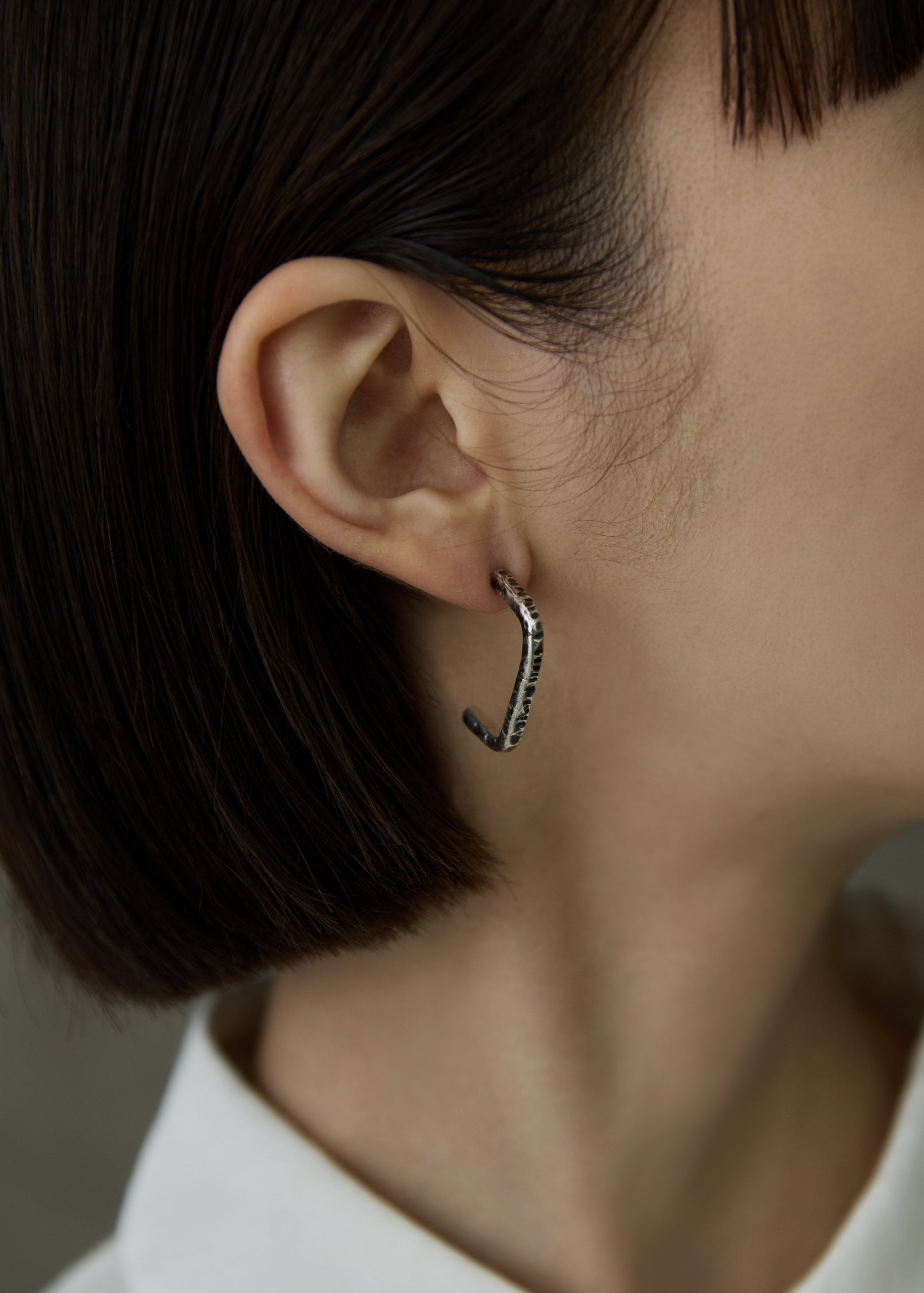 シルバー着用。いぶし加工を施したモノトーン調のピアスは、同じ加工を施したリングと合わせた着用もお楽しみいただけます。
