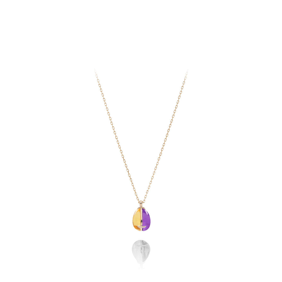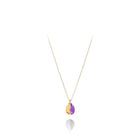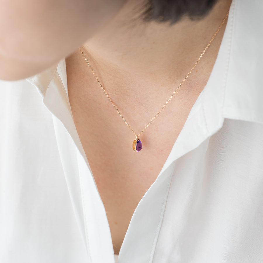 2色の石がひとつになって、お互いの輝きを引き立てあう“Day and Night Shizuku petit”。透明感あふれるしずく形のモチーフを最小限の金枠でつなぎ留めました。小ぶりのモチーフが、胸もとで揺れるたびに輝きが変化する、表情豊かなジュエリーです。