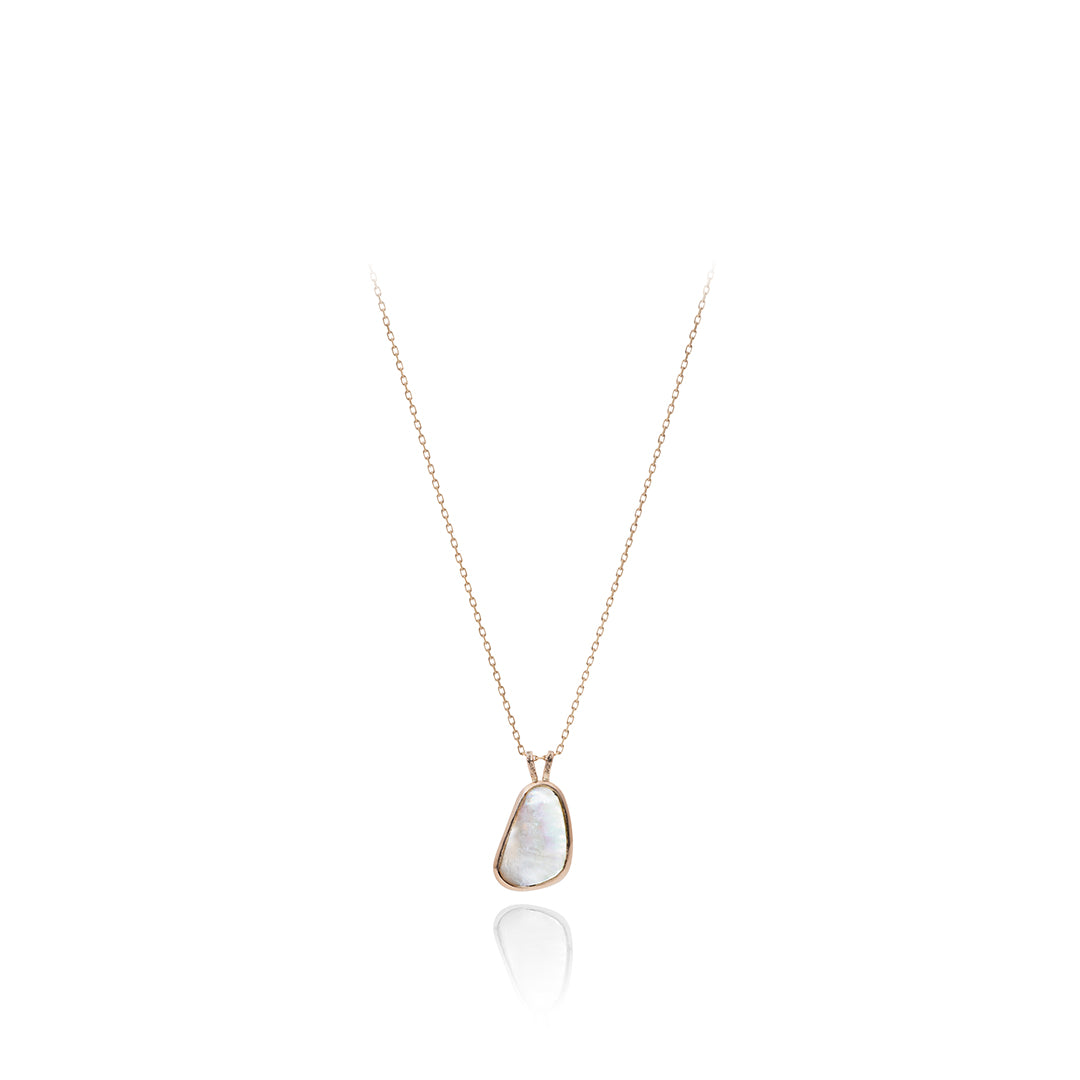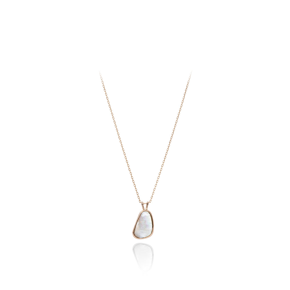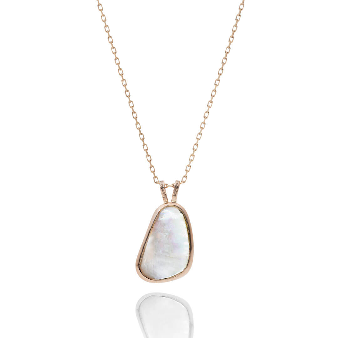 インドネシアで出会った個性溢れるマザーオブパール。虹色の輝きが際立つように平面カットを施し、有機的な曲線のモチーフに仕立てました。豊かな海が育んだマザーオブパールの個性を楽しむ、存在感のあるジュエリーです。