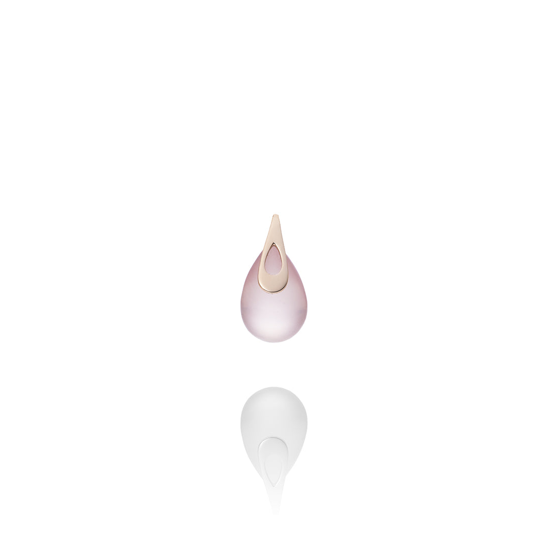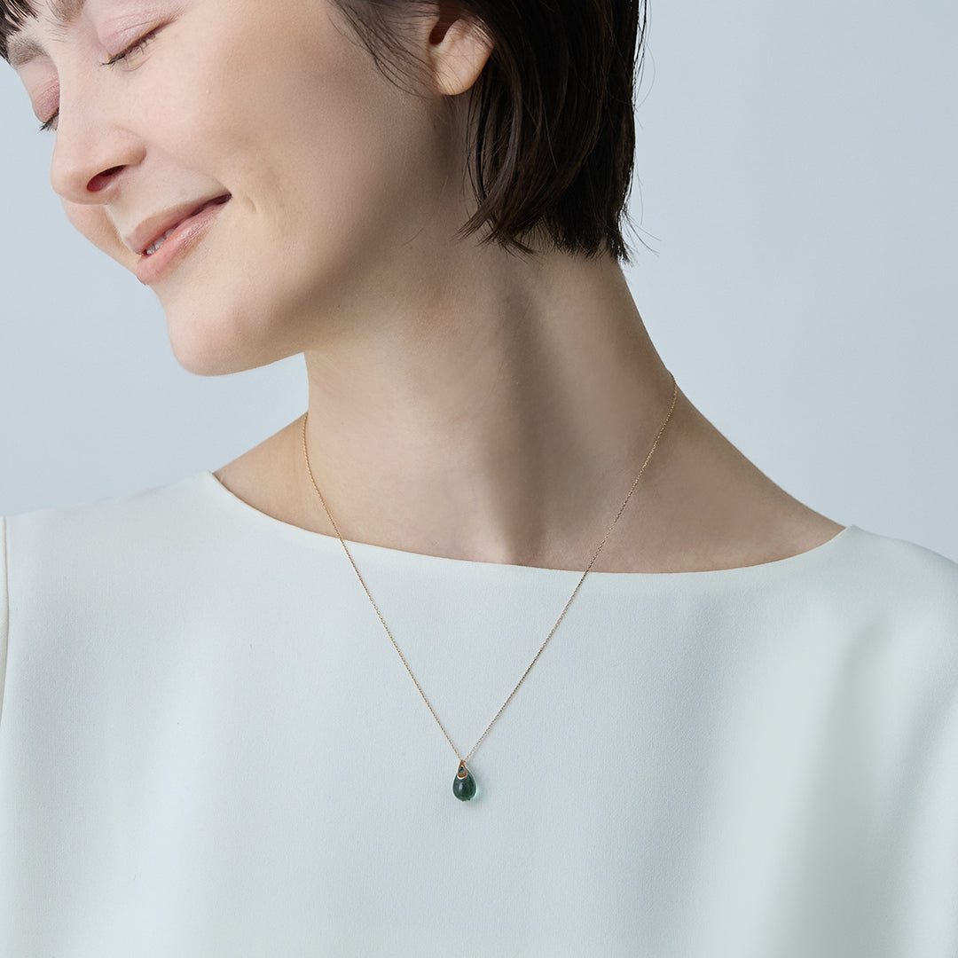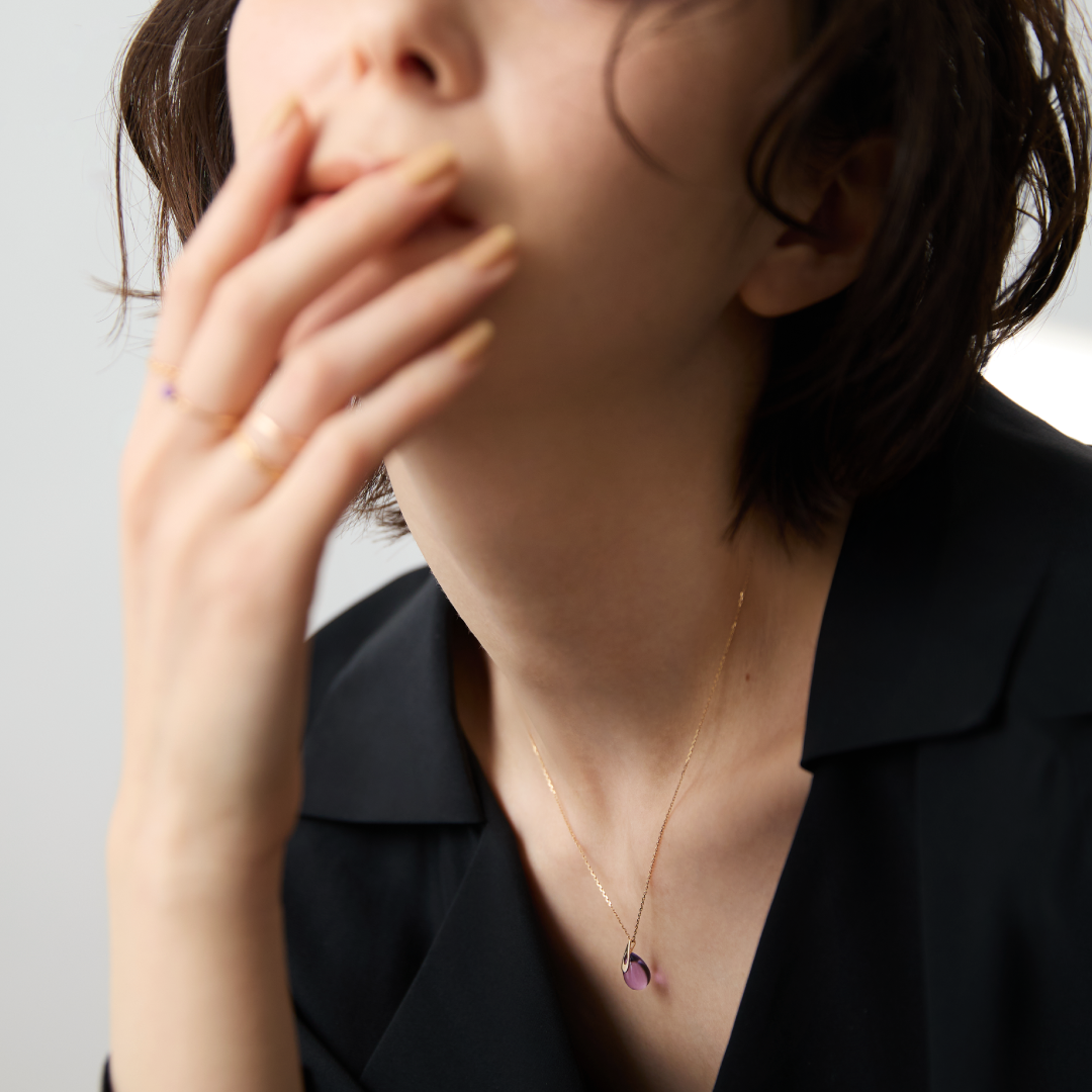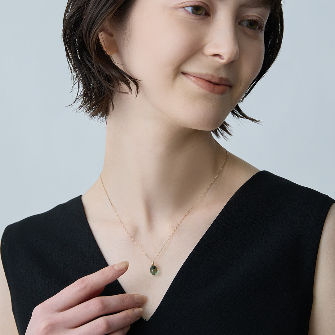 「葉」に見立てたバチカンが柔らかな「つゆ」を優しく支える、遊び心のあるデザインのIro-Tsuyuトップ。熟練の職人の手仕事により、天然石の柔らかな曲線や断面を0.1ミリ以下の単位で一点ずつ正確に合わせることで完成しました。シンプルながらも試行を重ねて完成したジュエリーは、胸元で優しい輝きを放ちます。留め具をデザインを主役として見せることで、シンプルながらも凛とした表情に。その日の装いに合わせ、留め具側を裏にして着用いただくことで、天然石の魅力をよりお楽しみいただけます。