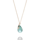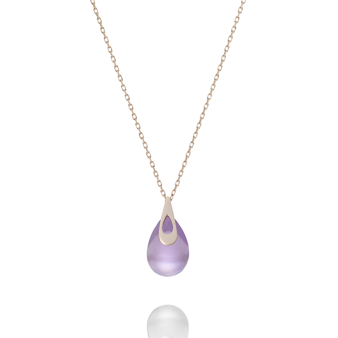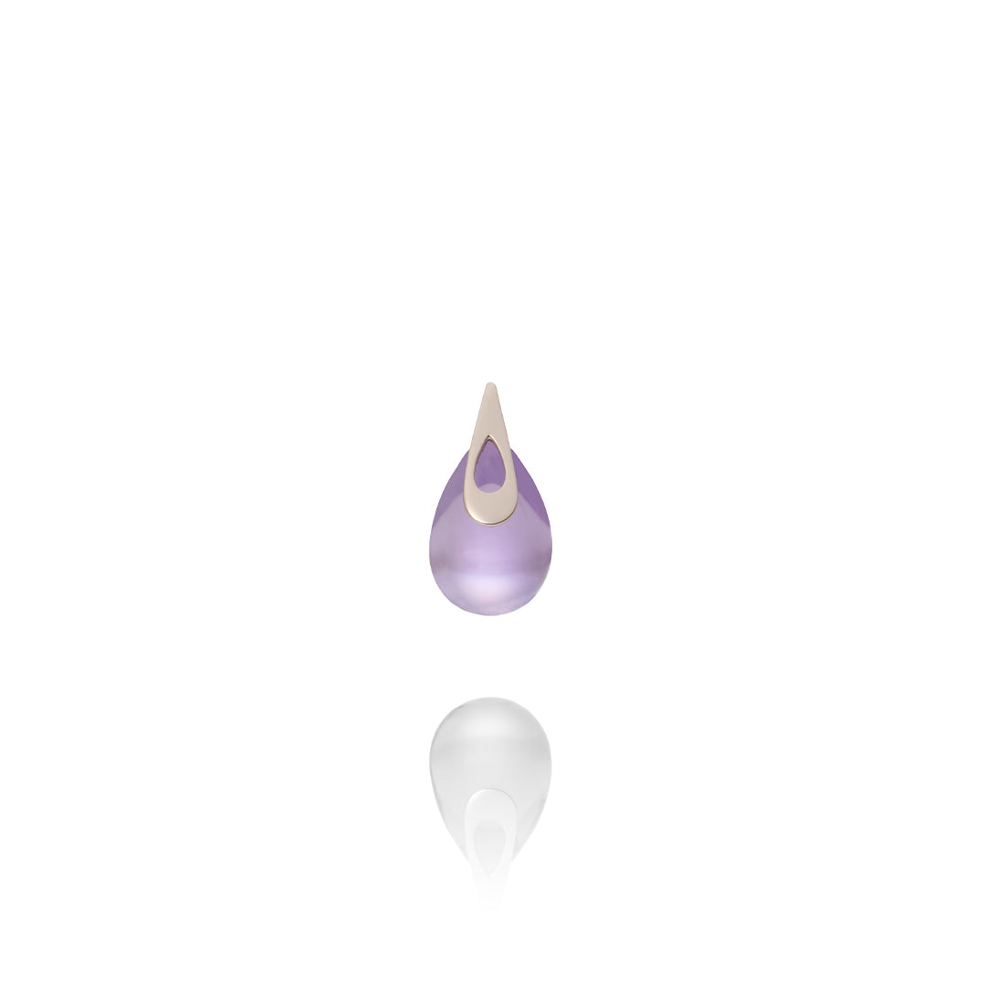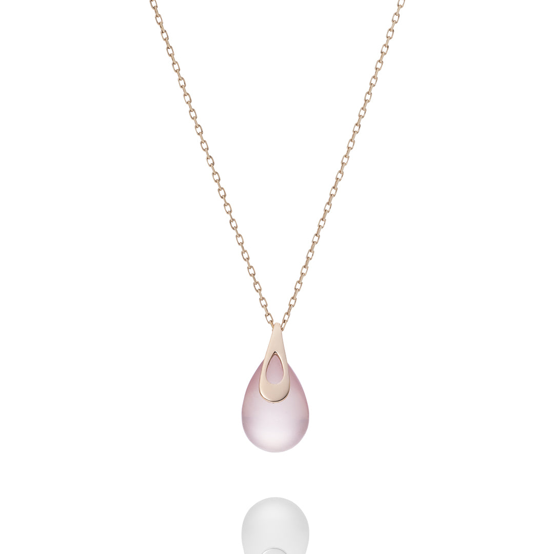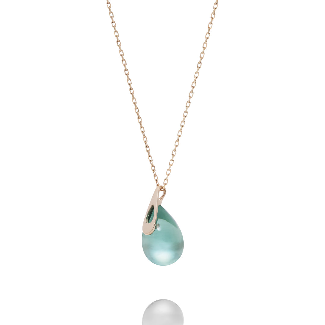 「葉」に見立てたバチカンが柔らかな「つゆ」を優しく支える、遊び心のあるデザインのIro-Tsuyuトップ。熟練の職人の手仕事により、天然石の柔らかな曲線や断面を0.1ミリ以下の単位で一点ずつ正確に合わせることで完成しました。シンプルながらも試行を重ねて完成したジュエリーは、胸元で優しい輝きを放ちます。留め具をデザインを主役として見せることで、シンプルながらも凛とした表情に。その日の装いに合わせ、留め具側を裏にして着用いただくことで、天然石の魅力をよりお楽しみいただけます。