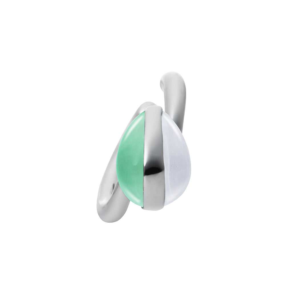 相反する2色の石がひとつになり、お互いの輝きを引き立てあうDay and Night Shizukuにイヤーカフが登場。カボッションカットを施した2つの天然石をミニマムなシルバーで留め、しずくを表現しました。 2色のコントラストが光るカラーストーンがポイントの、シャープな印象を演出するイヤーカフです。