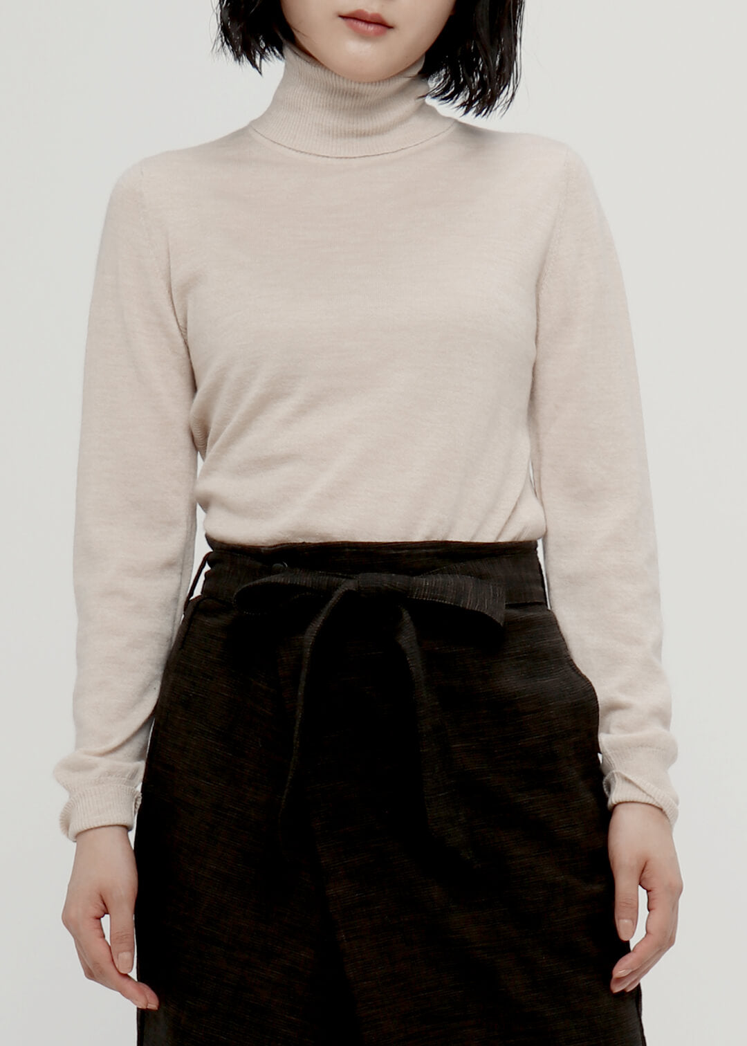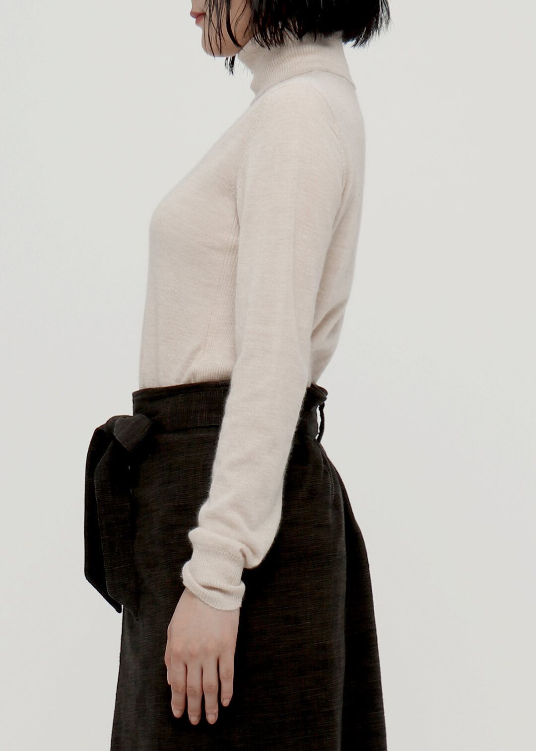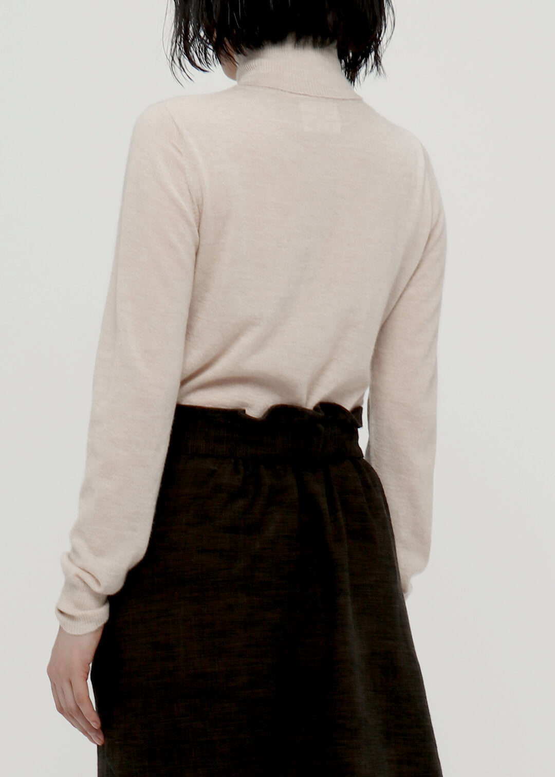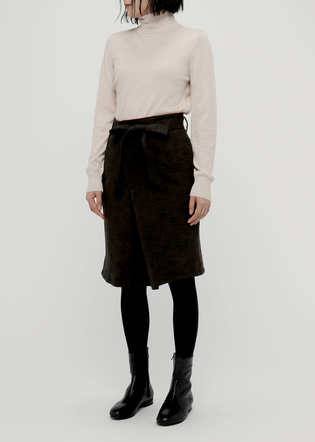 膝が見え隠れするくらいの丈感と、厚手の生地で仕立てたIラインのシルエットが、腰回りをすっきりと見せてくれます。カラータイツやレギンスと合わせて秋冬のコーディネートをお楽しみください。