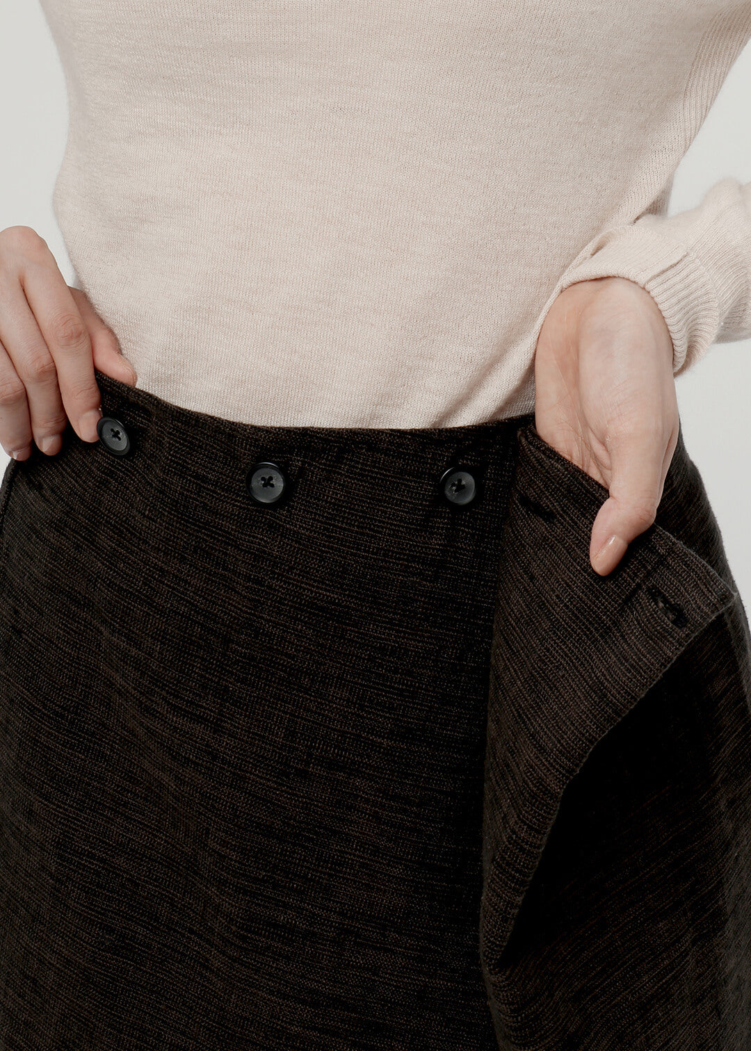 オックスフォードのしなやかな風合いをお楽しみいただけるラップスカートです。ウエストは内ボタンで3段階に調整ができ、ウエストをタイトにすると上品で女性らしい印象になります。共布のリボンはワンポイントに。ウエストゴム仕様で快適な着心地です。