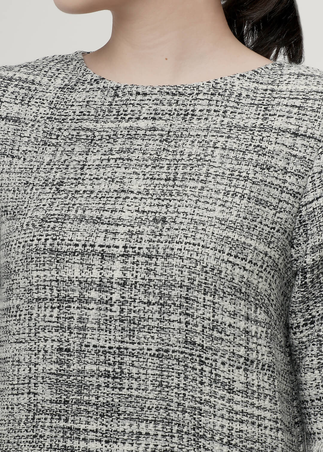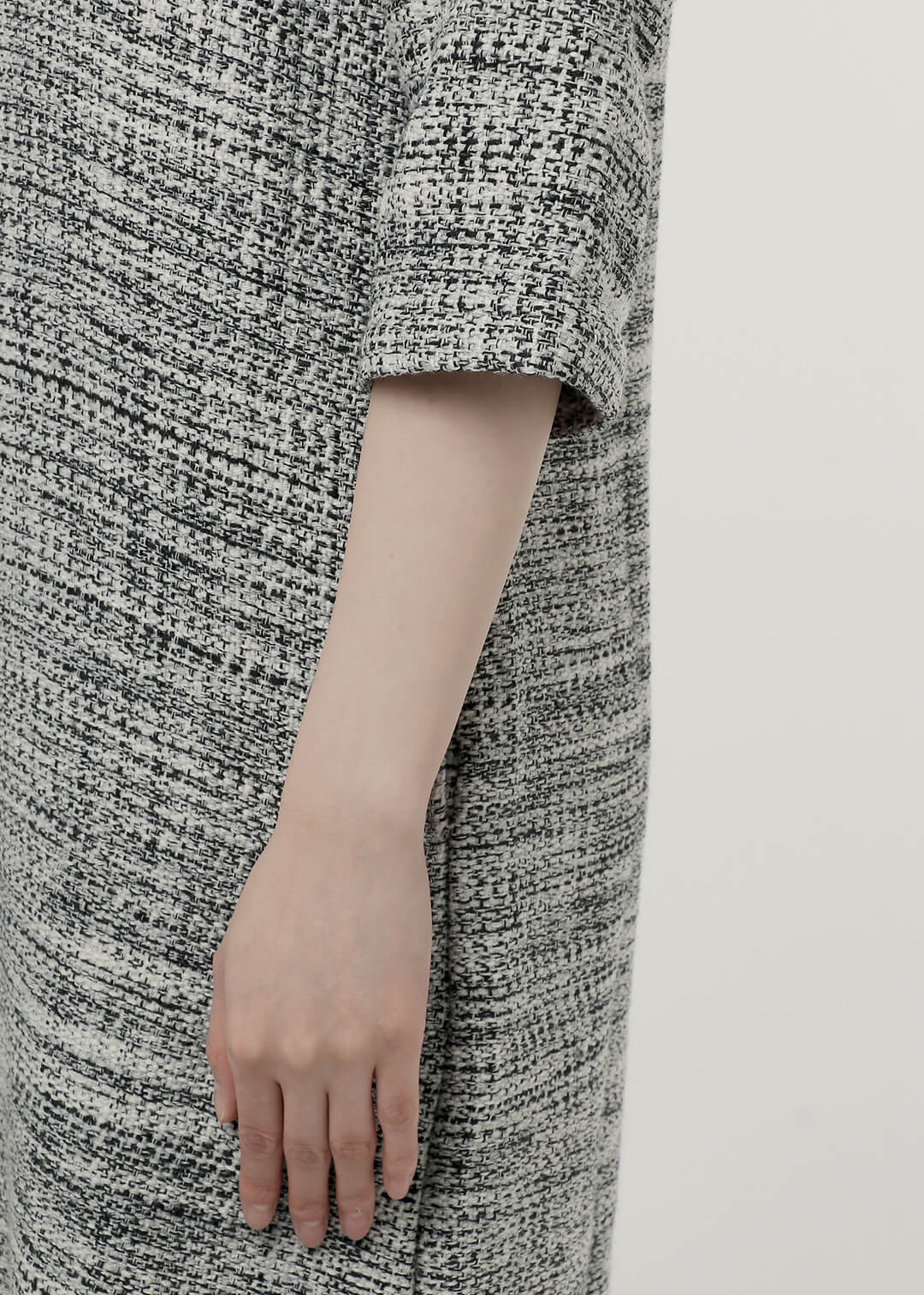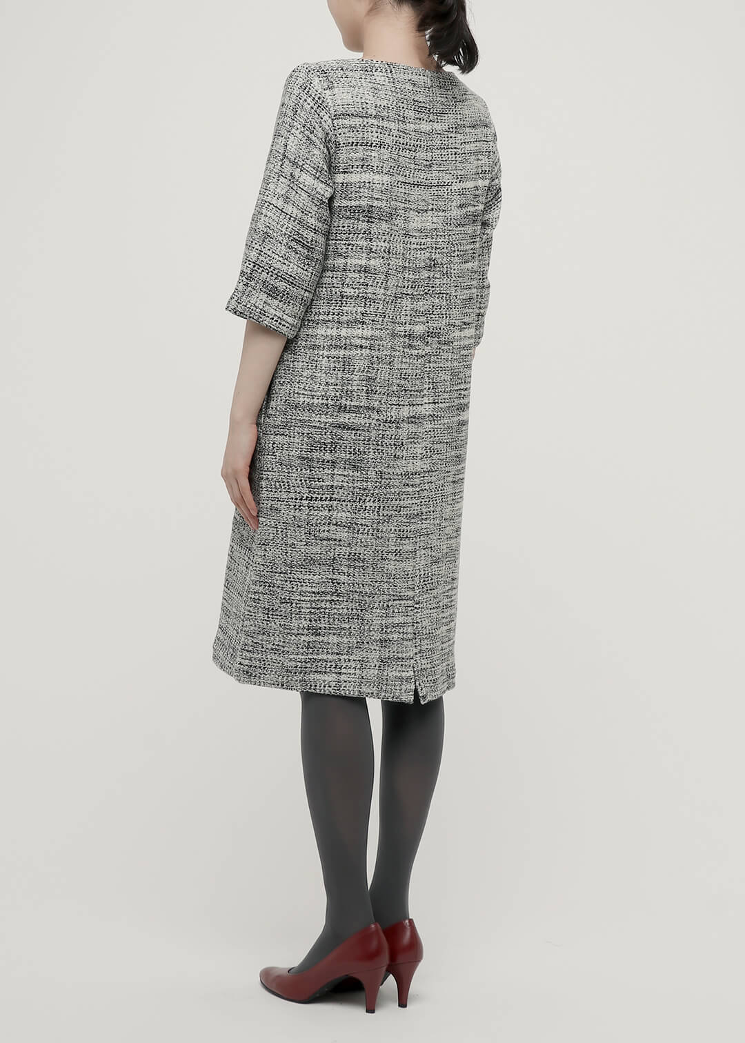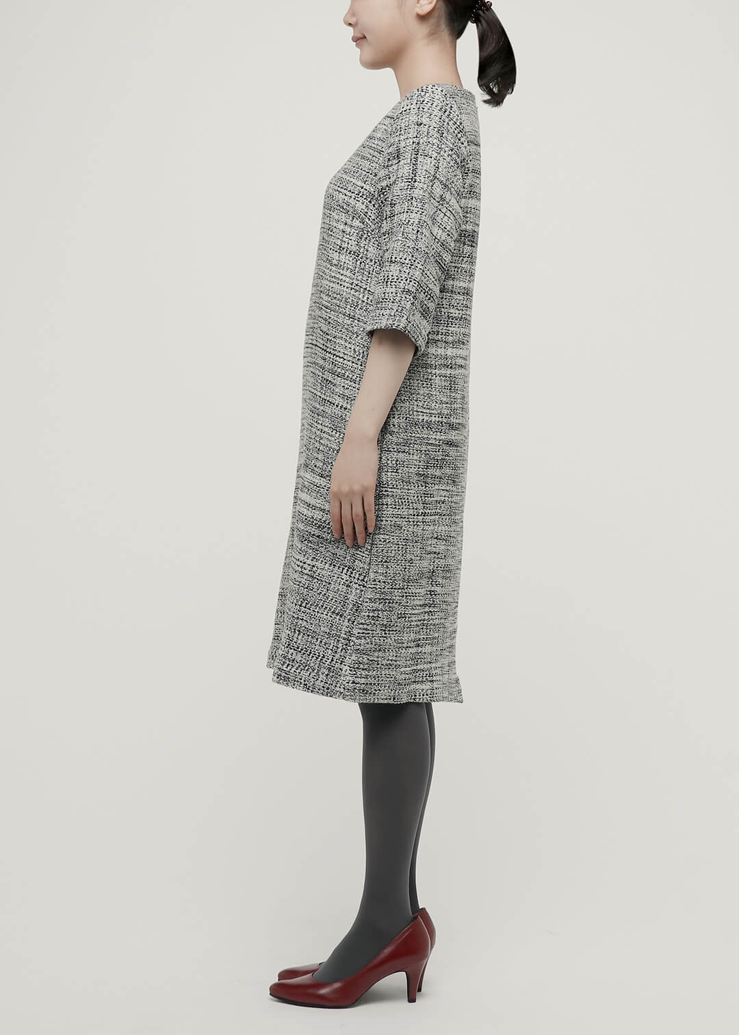 程よい厚みですが、着心地はふわりとやわらか。首回りは抜け感のあるデザインのため、軽やかな印象で合わせていただけます。すっきりとしたシルエットが美しく、タイツ・靴のカラーバリエーションによっても、雰囲気を変えて楽しめるワンピースです。