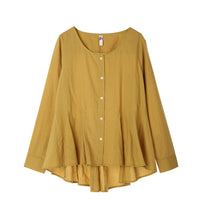 軽やかなカディで仕立てたユニークなデザインのブラウスです。ウエストから裾にかけてフレア状に広がるデザインにすることで、めりはりのきいた美しいシルエットに。後ろの裾は前よりも20㎝長く仕立てているため、腰回りを程よくカバーしつつ、前後での雰囲気の違いも楽しんでいただけます。ボトムスはロングスカートで柔らかに、パンツですっきりしたスタイルに、様々なスタイリングが可能です。首元はジュエリーやストールなども引き立つデザインのため、シンプルなコーディネートはもちろん、気分に合わせて小物を取り入れるなど、秋の幅広いコーディネートをお楽しみください。