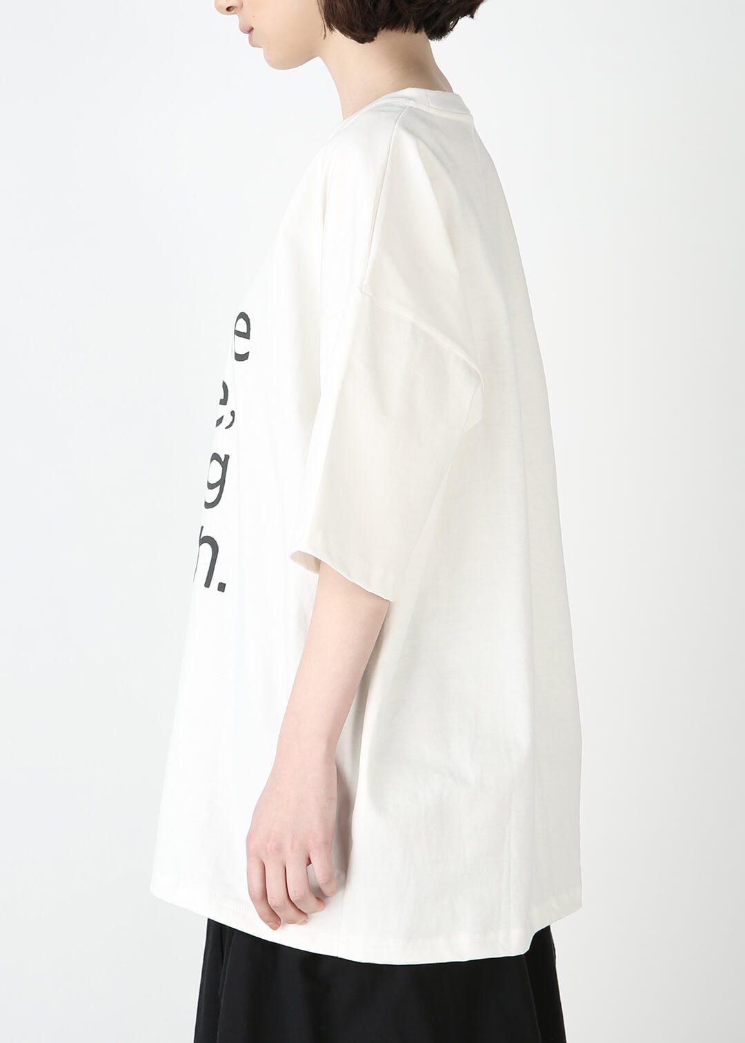リラックス感のあるユニセックスTシャツです。ERIKO YAMAGUCHIのコンセプトでもある「Beyond The Difference, Something in Common」を職人がブロックプリントで印字。全て手仕事のため、プリント時の力の入れ具合によっても一枚一枚かすれ具合は異なり、そのメッセージの通り「違い」を楽しんでいただけるデザインに。モノトーンの色合いにすることで、ボトムスを選ばずあわせていただける一枚に仕上がりました。