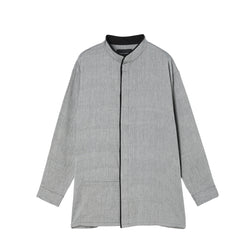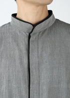身頃に大きなパッチポケットや、襟から前立て部分にパイピングのデザインを加えることで、シンプルさの中にアクセントを添えています。