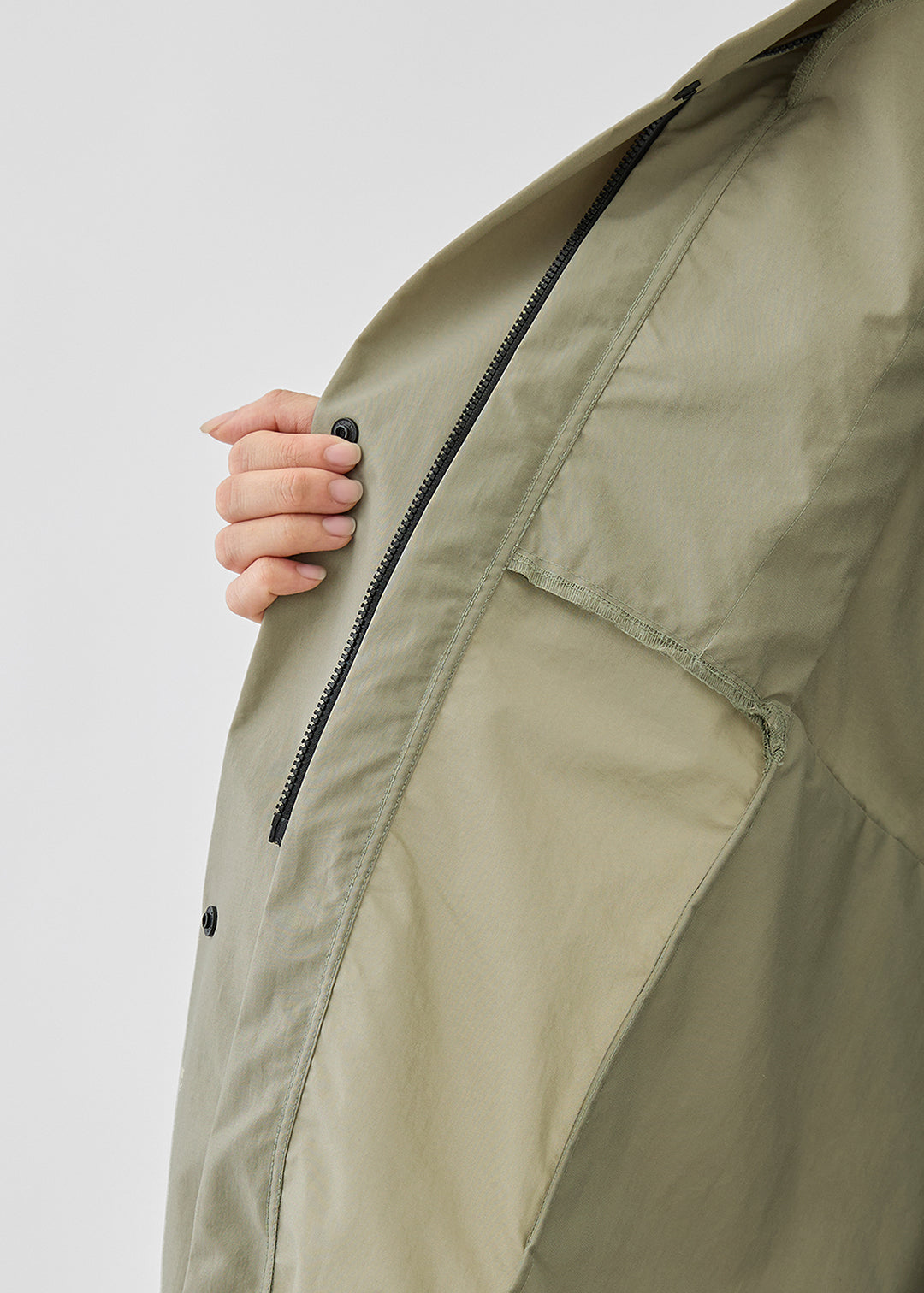 ファスナー部分が隠れることで、アウトドアな見え感を程よく和らげすっきりした印象を添えます