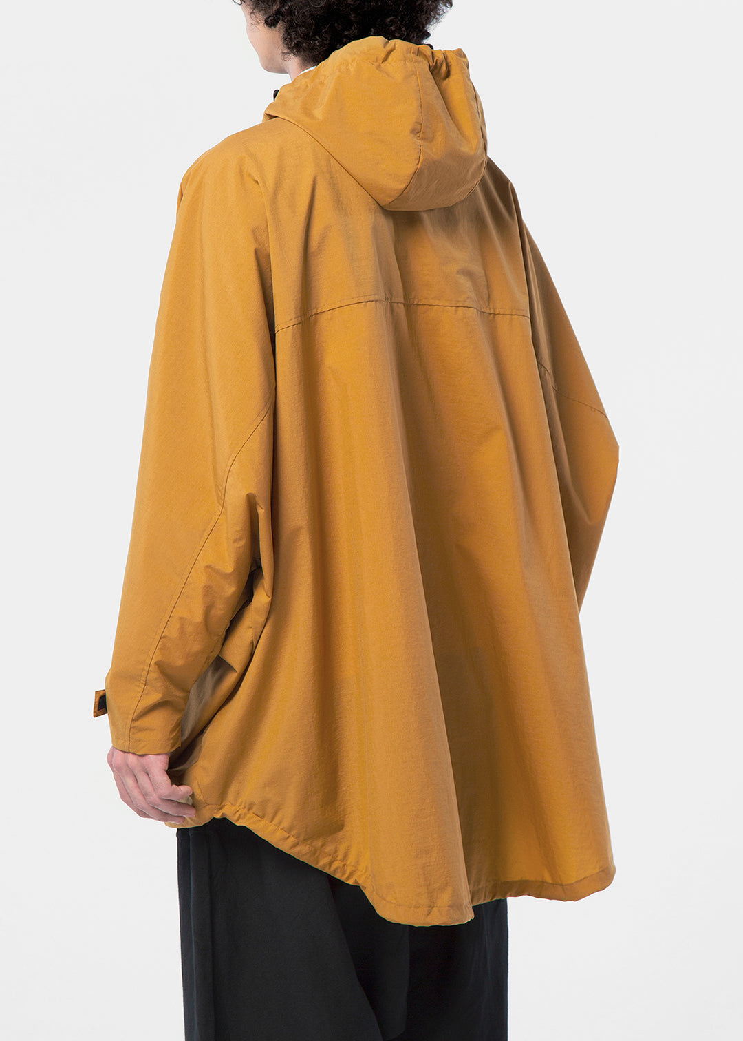 バックパックを背負ったままでも着られるデザインは今回のこだわりの一つ。裾は前より後ろが長くなるよう仕立てているため、きれいなシルエットで着用いただけます。